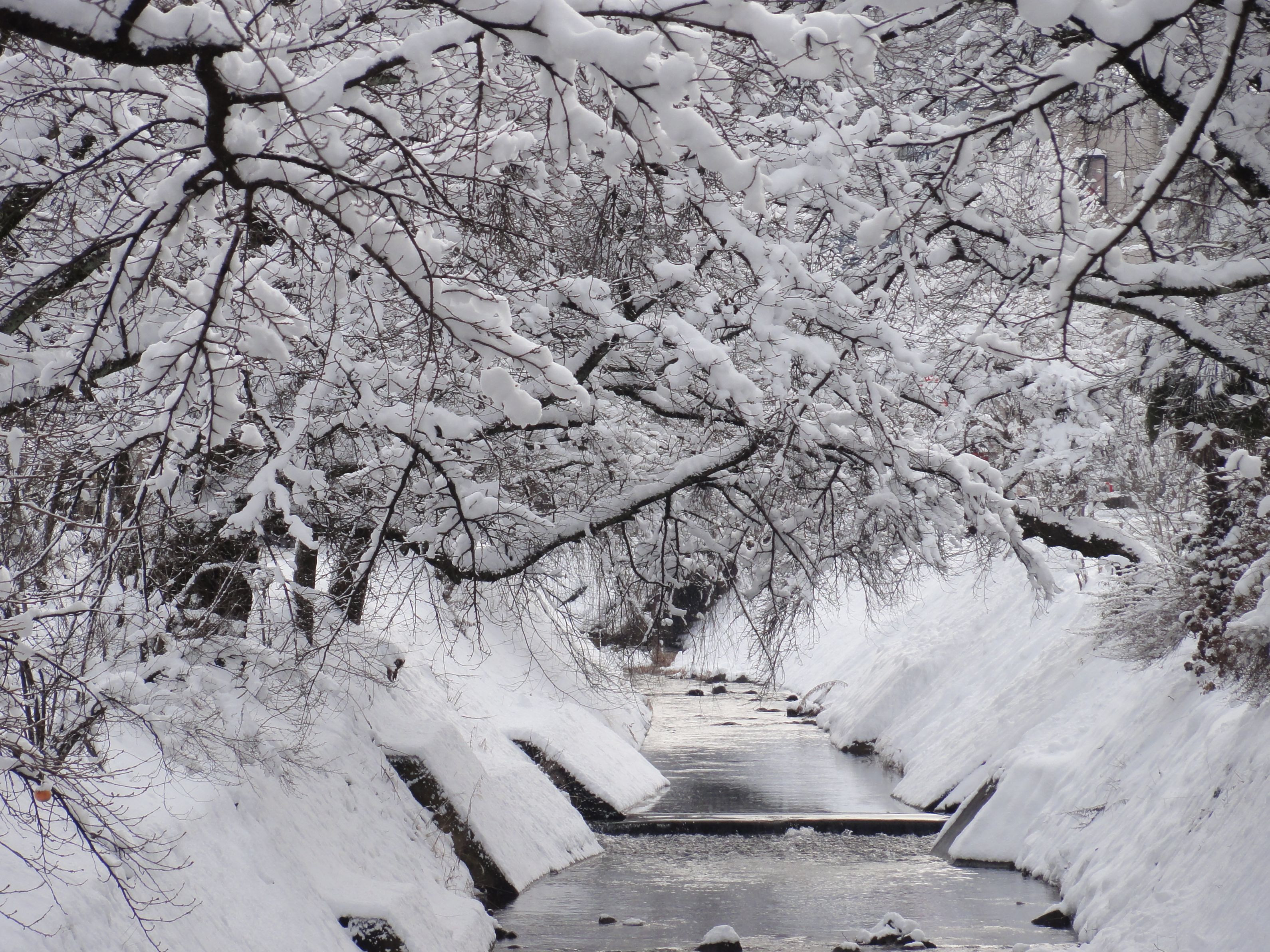 高山市内を流れる小川。大晦日から降り続いた雪が止んだ元旦の朝。