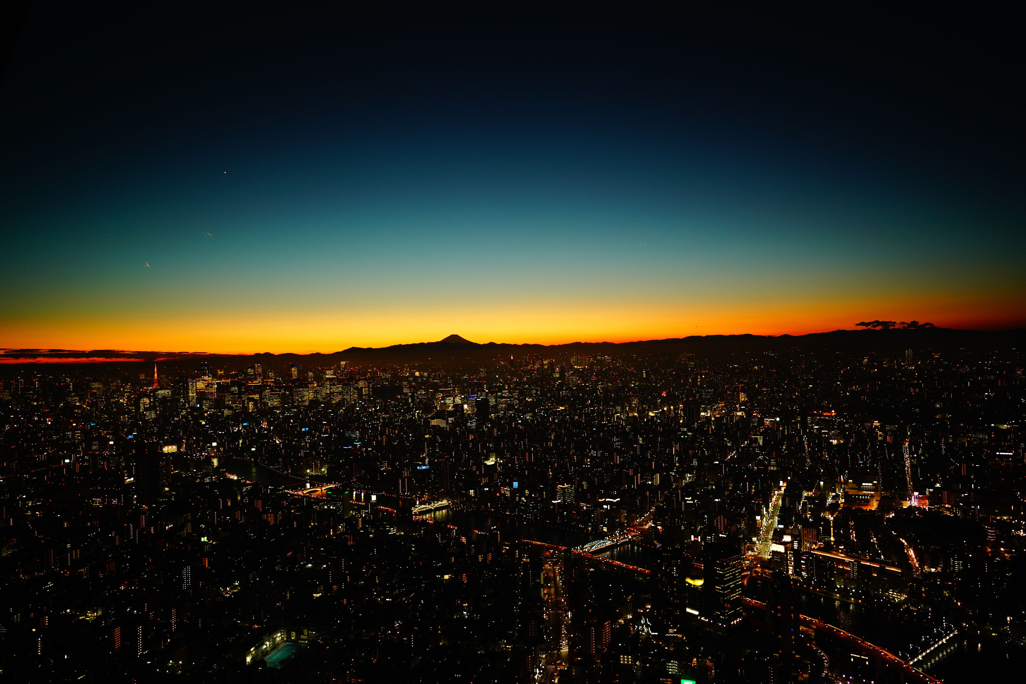 夕焼けに染まる東京の街と、富士山です。