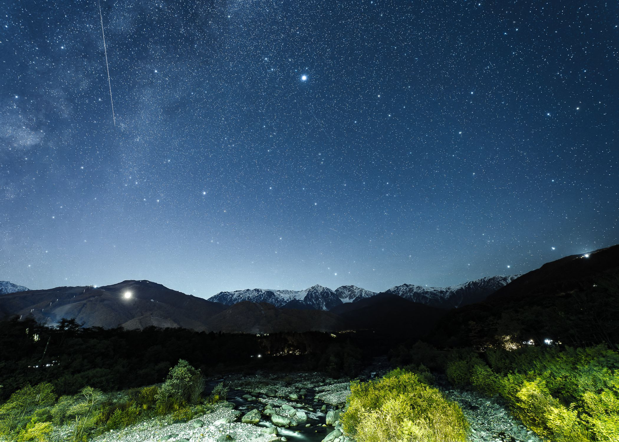 初冠雪したばかりの白馬三山にかかる天の川を撮影中、偶然巨大流星が飛び込んでくれました。