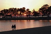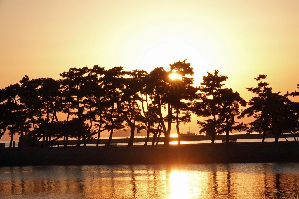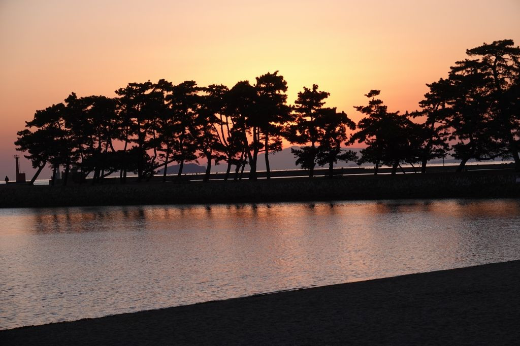 近くの海浜公園の松林に夕日が沈み出し手前の海岸線を カップルが散歩し夕日も島影に沈む