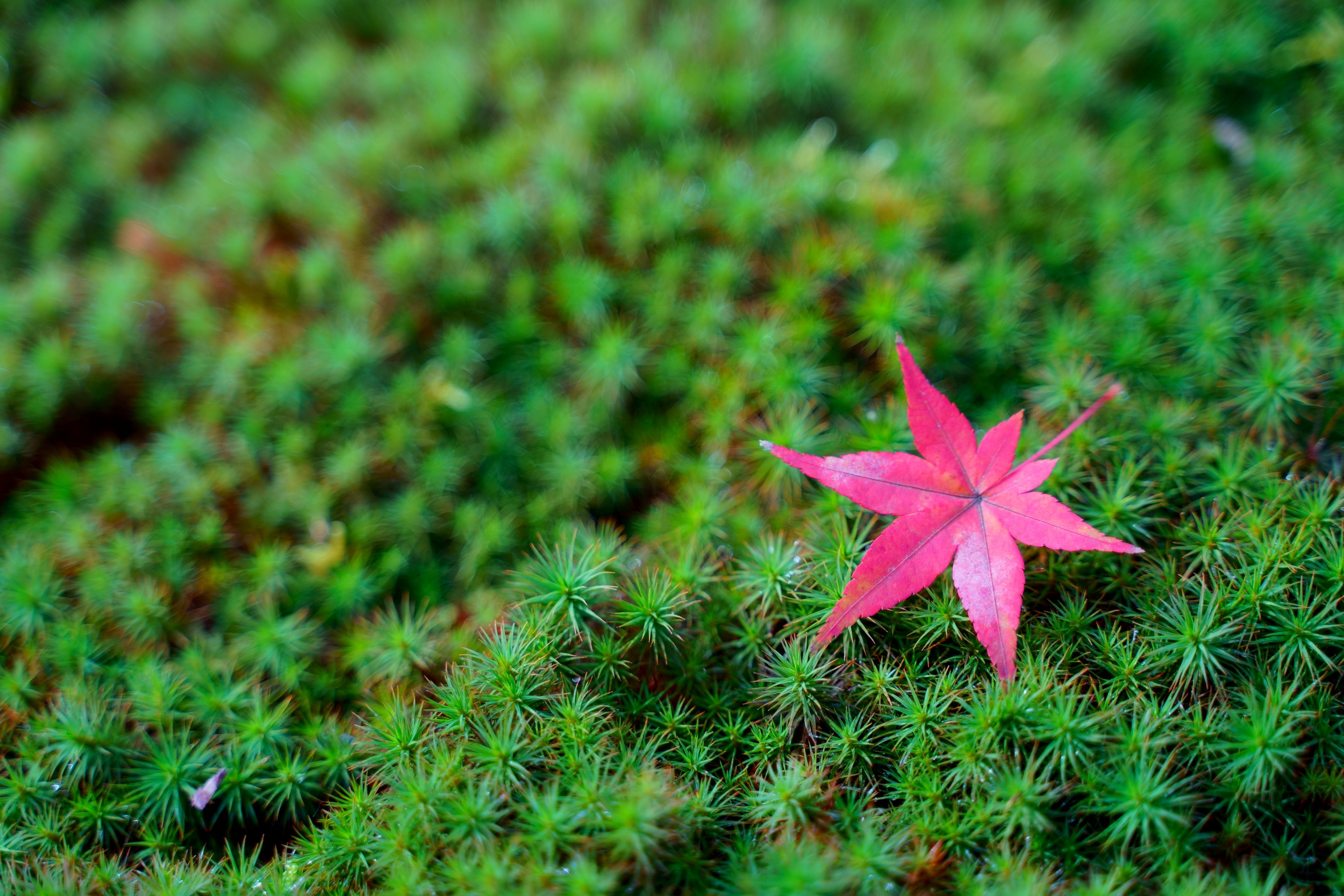 苔の絨毯に紅葉が一片落ちていました。