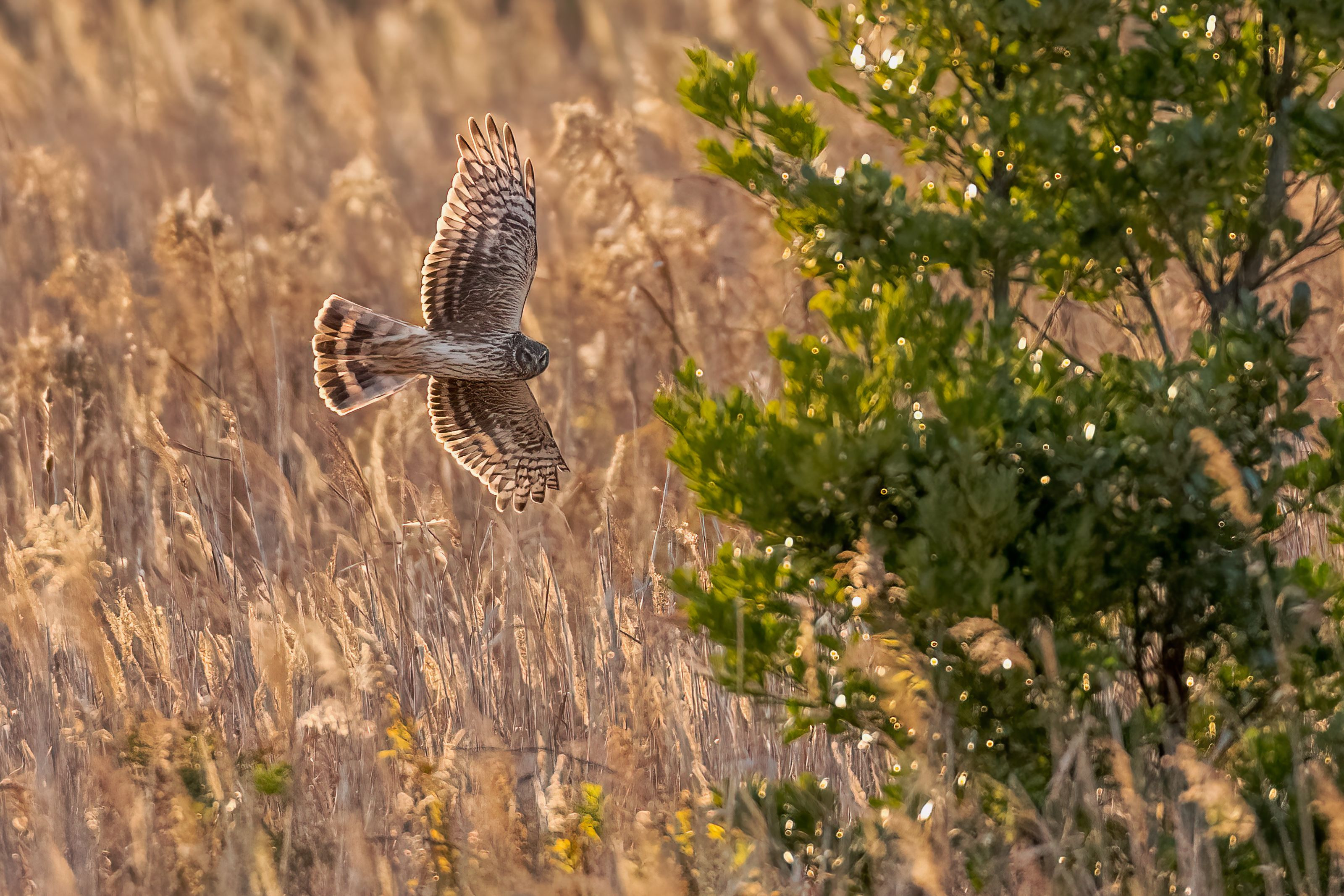 夕日に照らされたハイイロチュウヒ。 ターンをしながら、こちらをガン見。