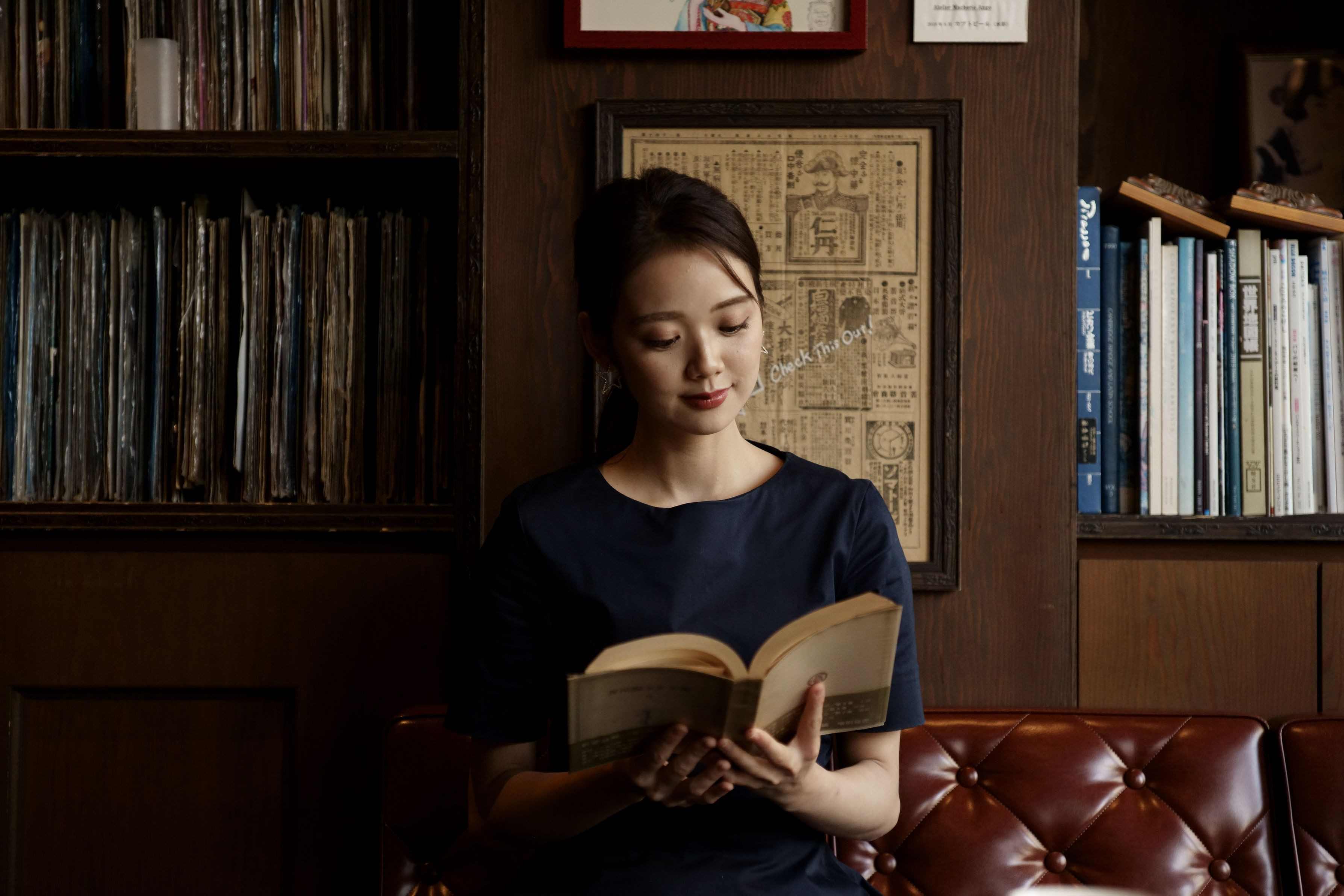 井川拓也先生の写真講座 納谷橋TWIROでモデル撮影 背景の古い新聞の上に書かれた「check this out」の文字。後から書き込んだのではありません。タイトルに借用しました。 モデルは高倉レナさん。