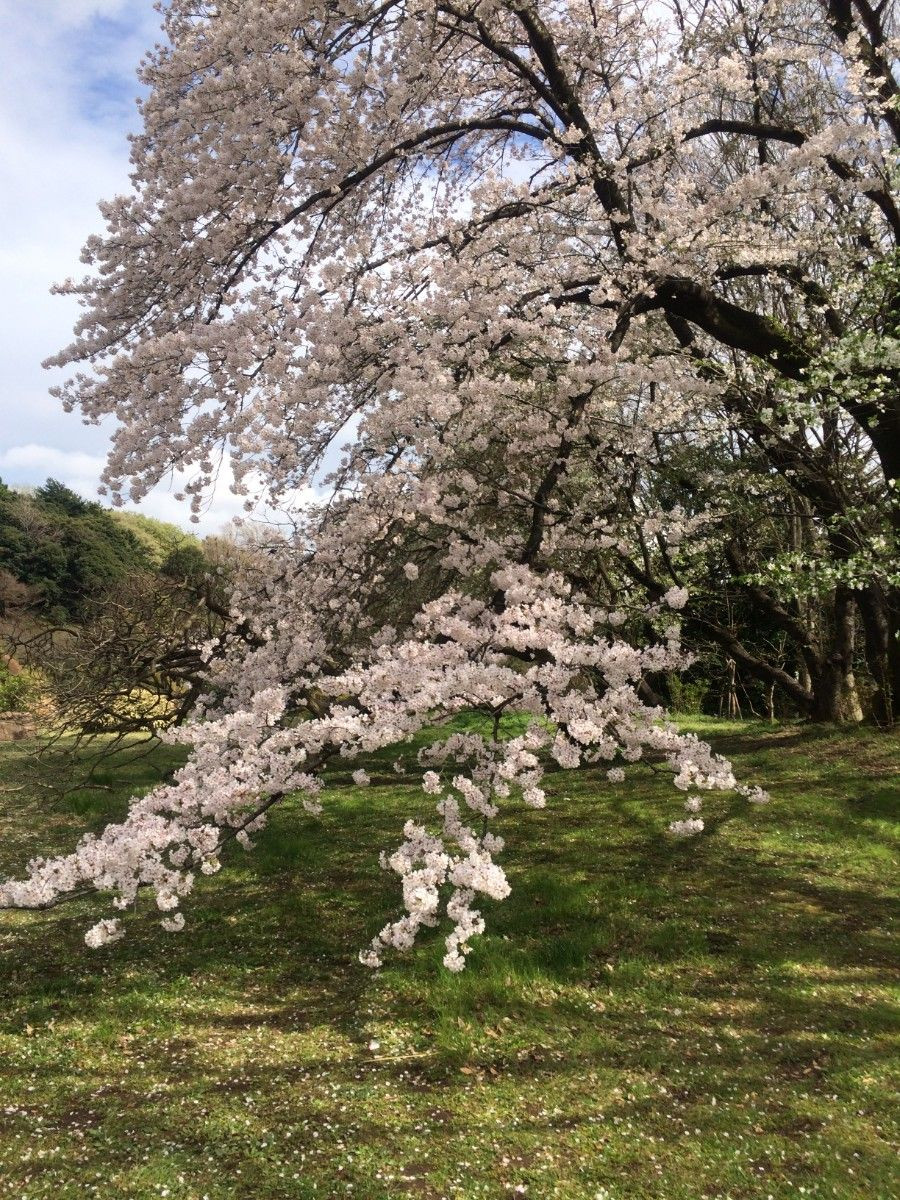 文京区の植物園で満開の桜です。地面まで垂れ下がり、「どうだ」と言わんばかりの堂々とした桜でした。