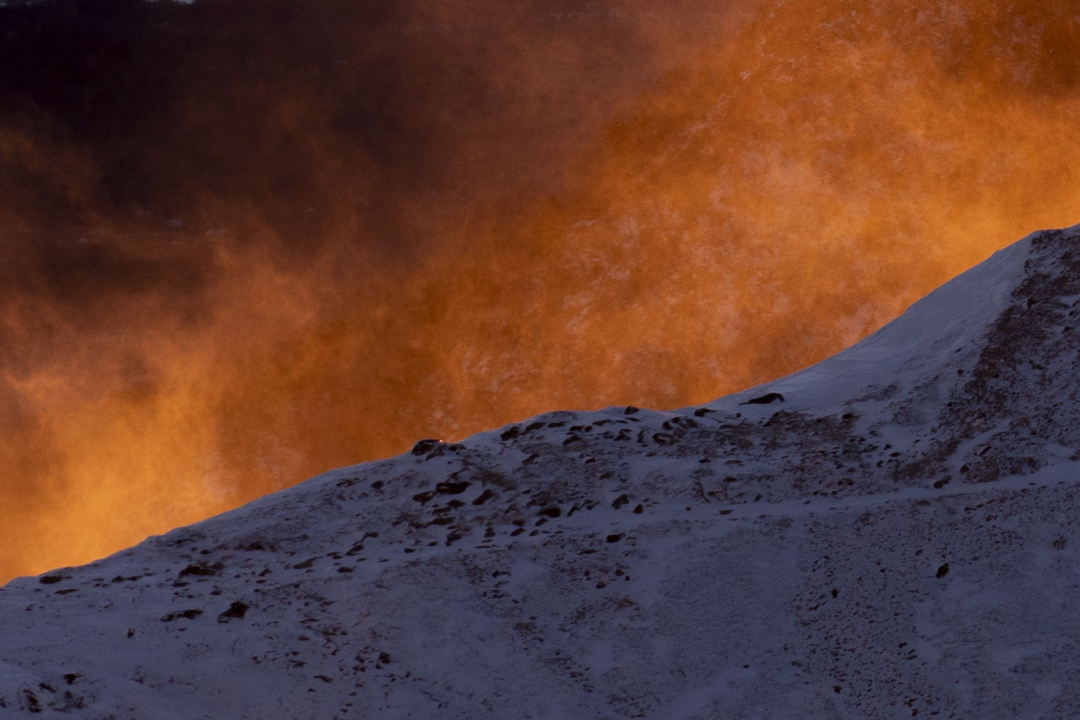朝の八ヶ岳。 爆風で舞う雪に朝日が差しました。