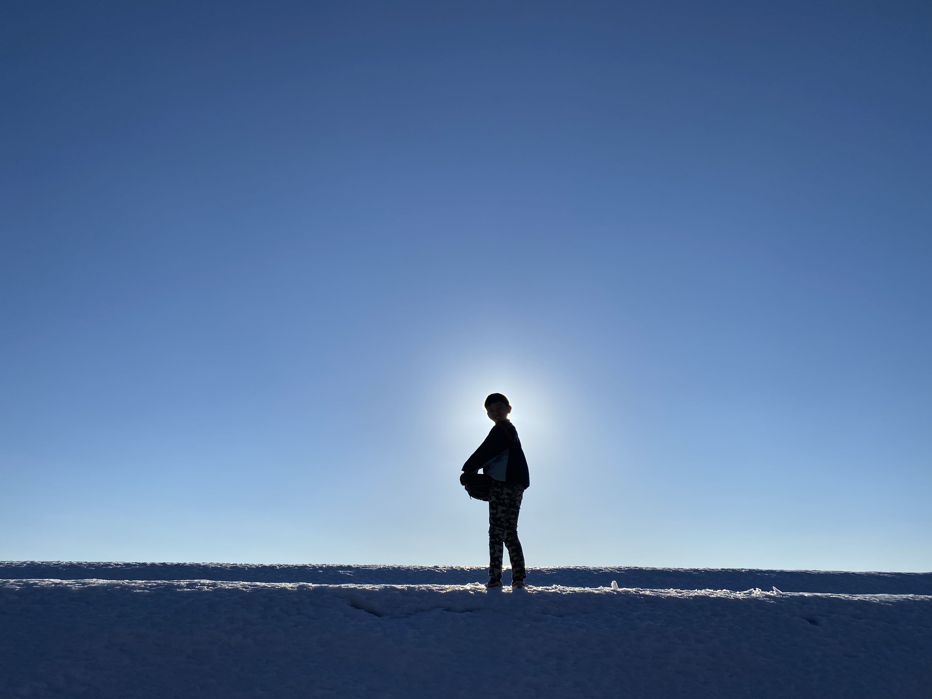 快晴の空に気持ちのいい太陽、残雪の上に立っていた息子と重なっていい感じの後光効果になったのでパシャリ