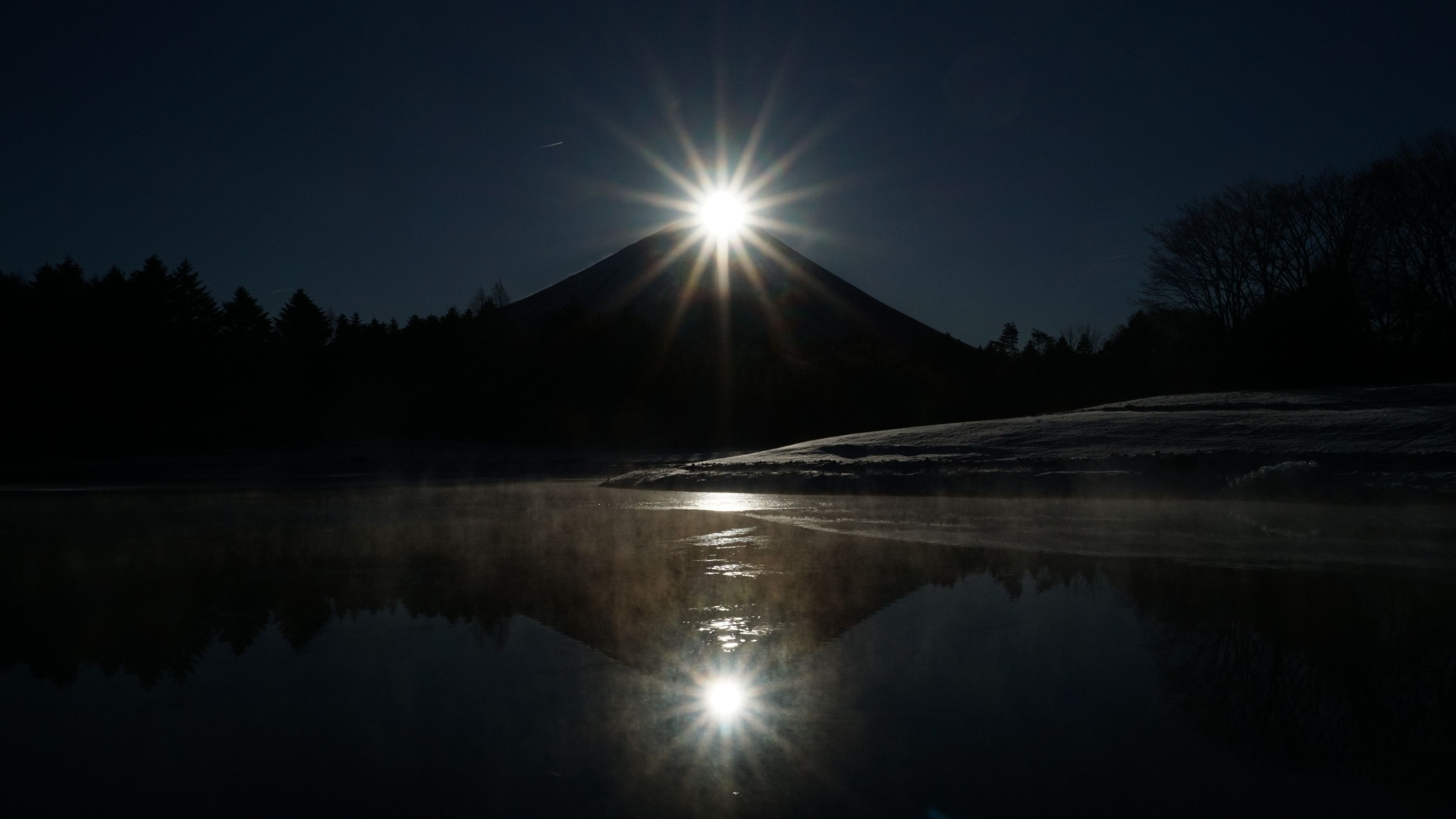 1/9(日)早朝、山梨県にある富士本栖湖リゾートでダイヤモンド富士を撮ってきました。ここでは毎年12~1月にかけて、昇るダイヤモンド富士を鑑賞することができます。 明け方は氷点下7℃くらいまで気温が下がる厳しい冷え込みでしたが、風もなく穏やかな快晴に恵まれたため、竜神池にも映る「ダブルダイヤモンド富士」を見ることができました。