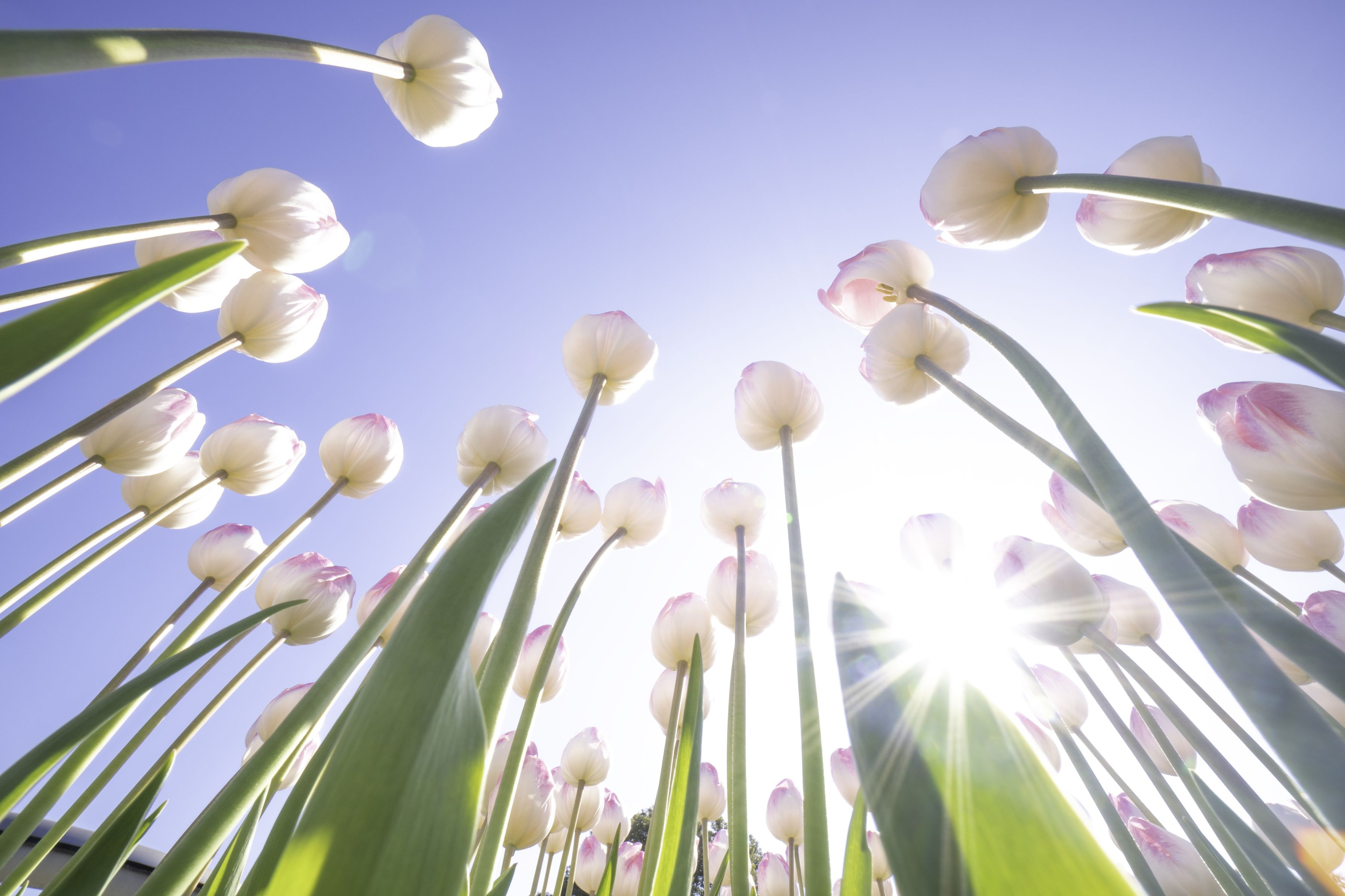 冬の寒さにも負けずに咲き続けるアイスチューリップ。 天高く青空へ向かって咲く様を、光芒とともに撮ってみました。