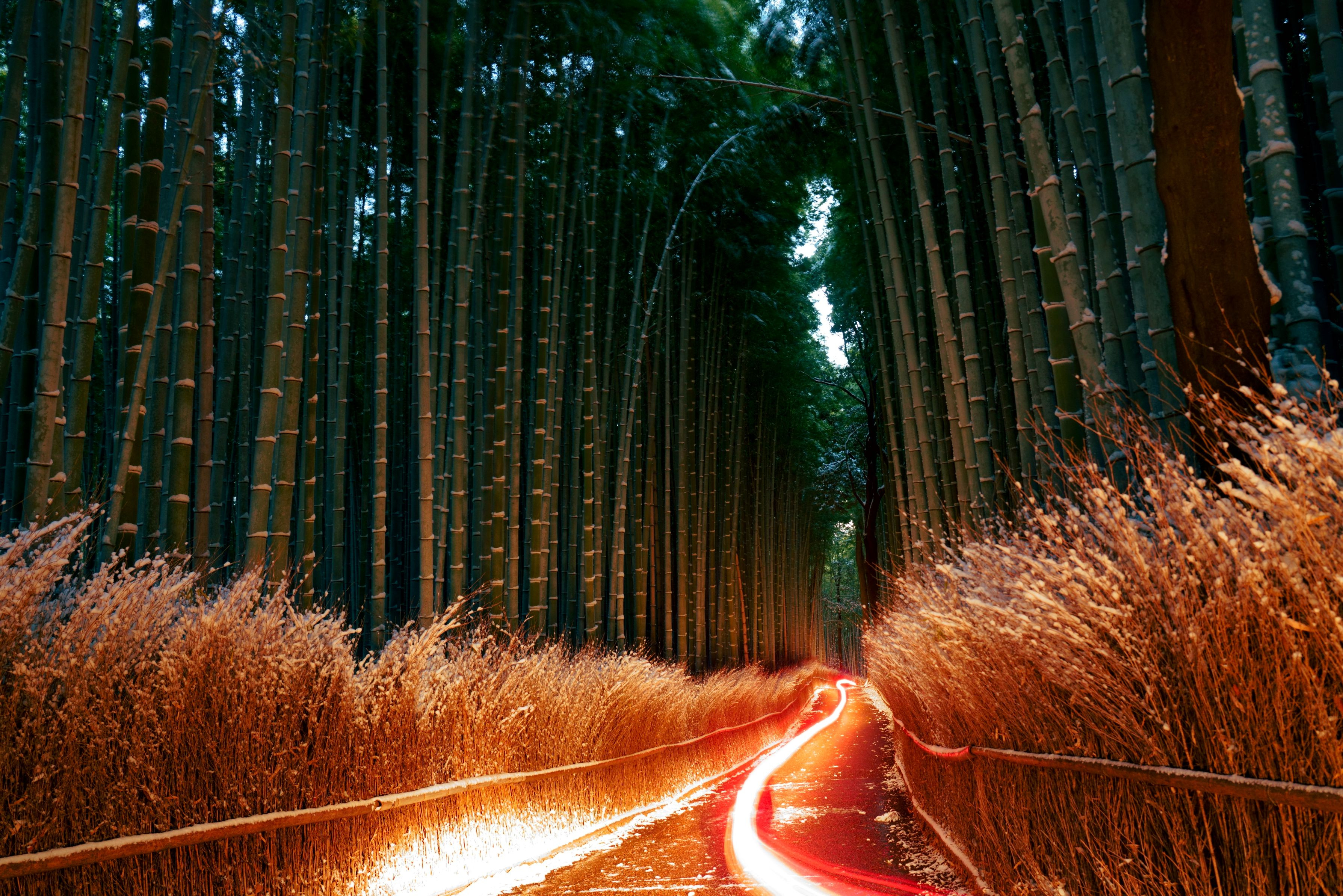雪が降ってもあまり積もらない竹林の小径、ダメもとで暗いうちから向かいました。案の定、上部の笹がバリヤーになって雪景色とはいきませんでしたが、幸運に恵まれました 背後の脇道から大河内山荘に来た新聞配達のバイクがここを通って帰る時、ヘッドライトが竹林全体と節の白い着雪を、テールランプが赤茶色の柴垣を浮かび上がらせて、直前にシャッターを切っていたカメラに信じられない描写を残してくれました