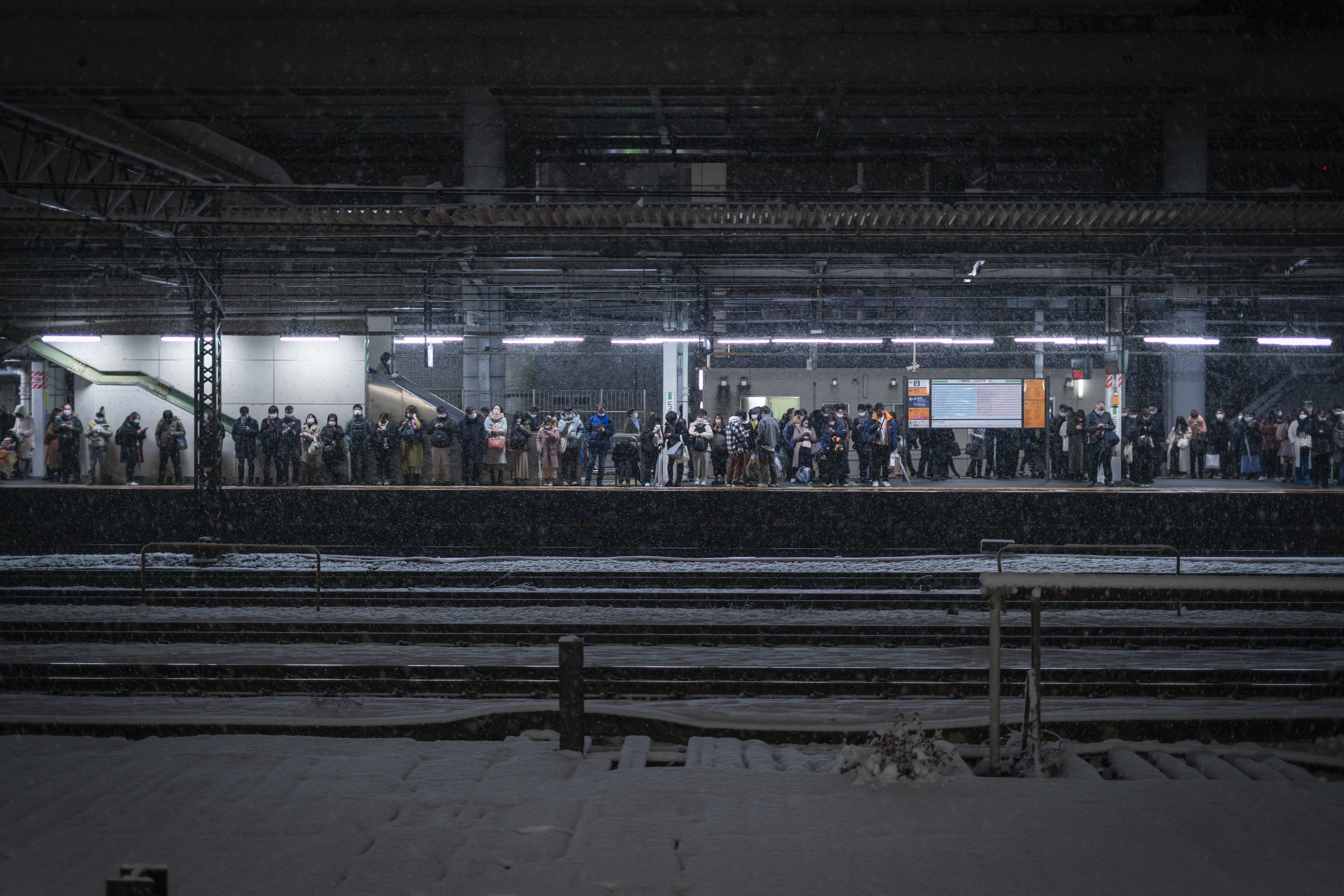 雪の降った日に日暮里駅で撮影しました。 いろんな人たちが電車を待っているという日常の中で雪が降るという非日常が合わさり とても不思議な感覚に襲われたので撮ってみました。