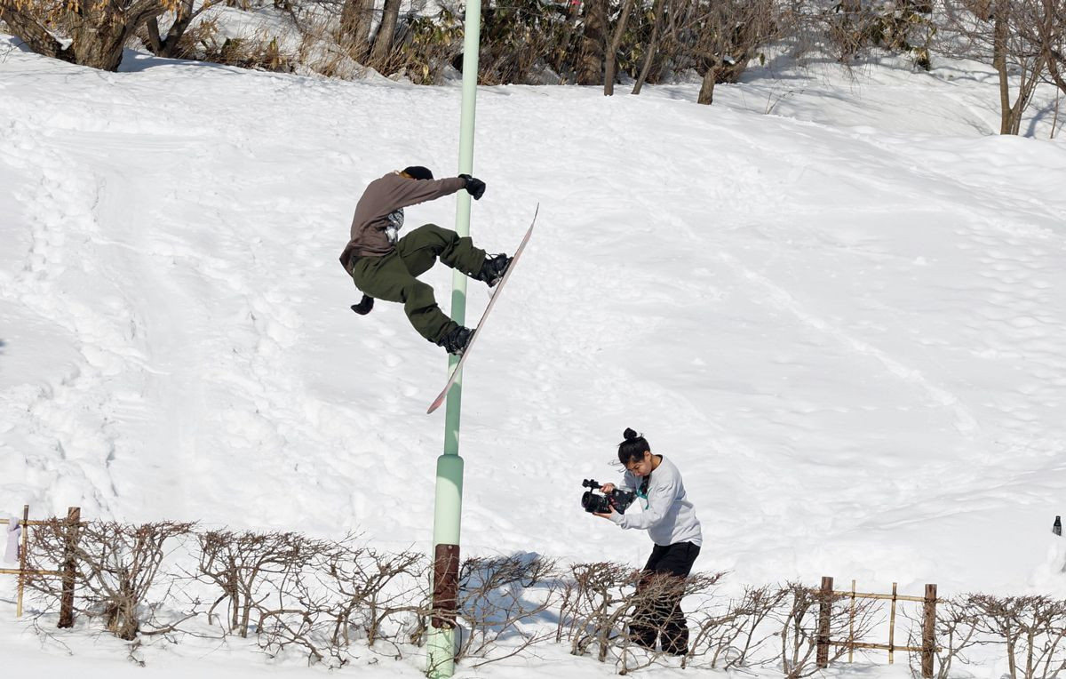 スノーボードを鉄柱にぶつけて、バランスをとり かっこよく滑るのが流行っているようです