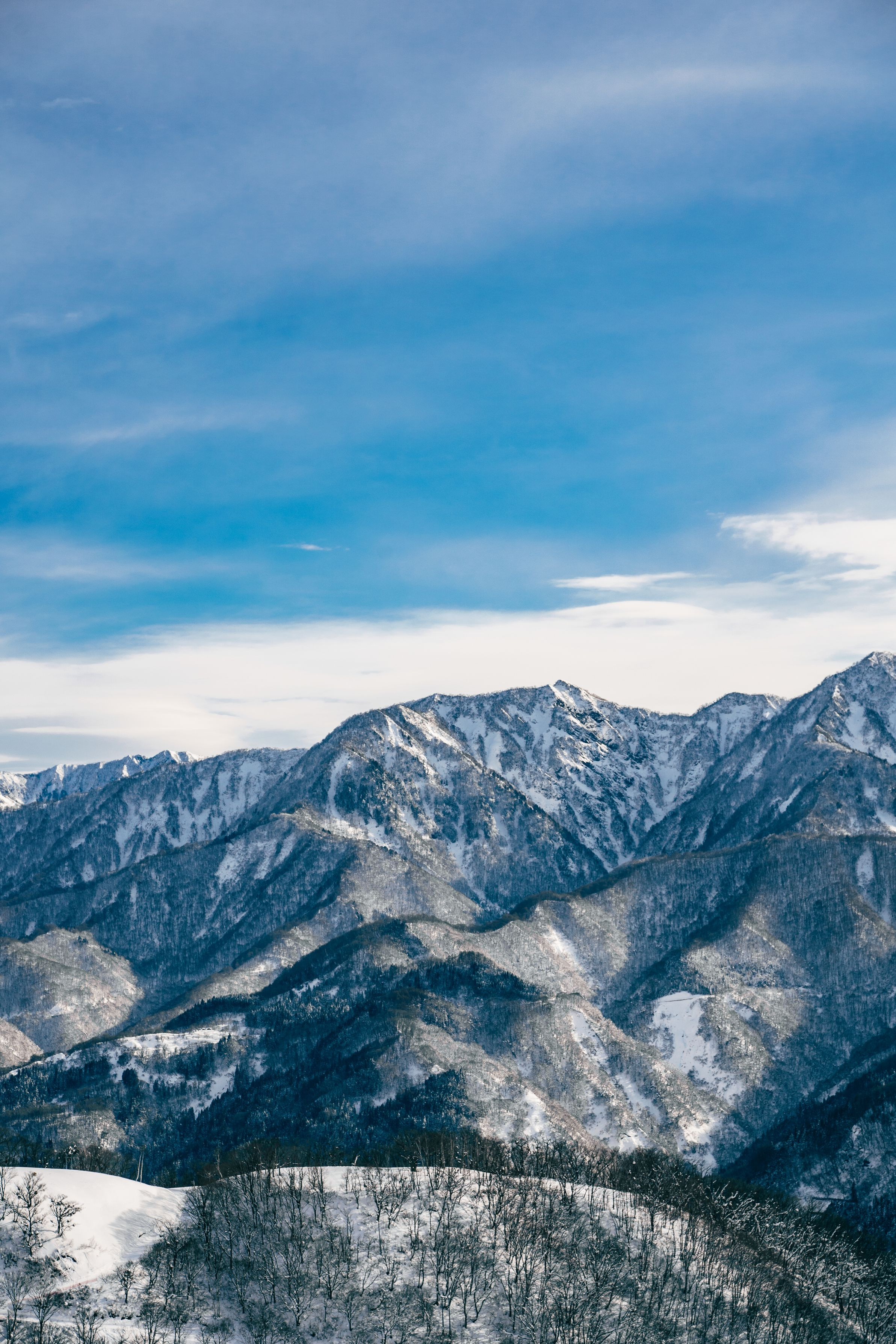 2021年の年末に撮影した長野県にそびえる北アルプスの写真。 雪の白色と樹木の黒色が作り出すコントラストは山々の造形を一層際立たせ、冬にしか見ることが出来ない素晴らしい景色でした。