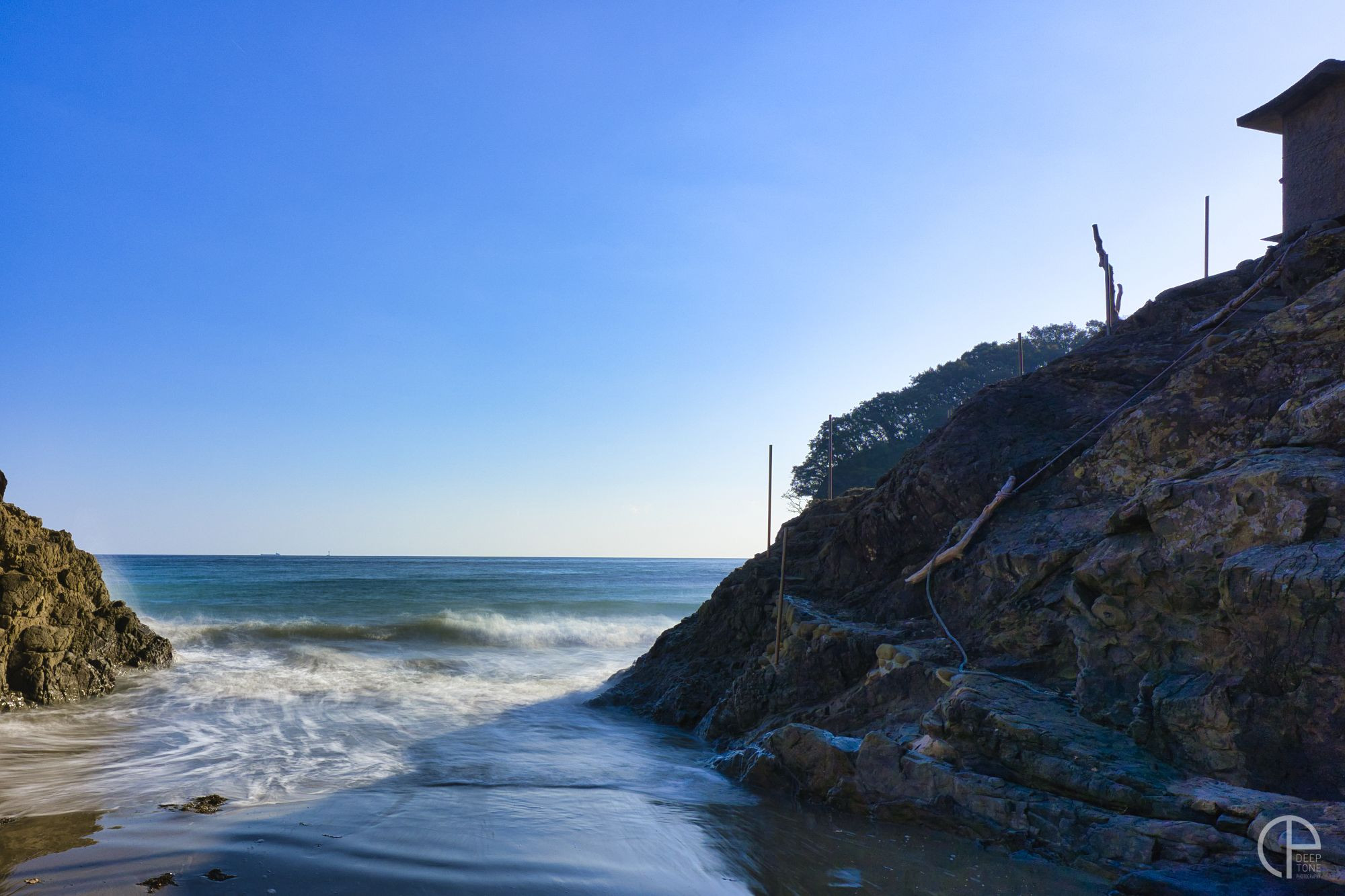 岩の上にある水神さんをまつる祠にお参りするのも、満ち潮時には濡れずに上に登るのは難しい!