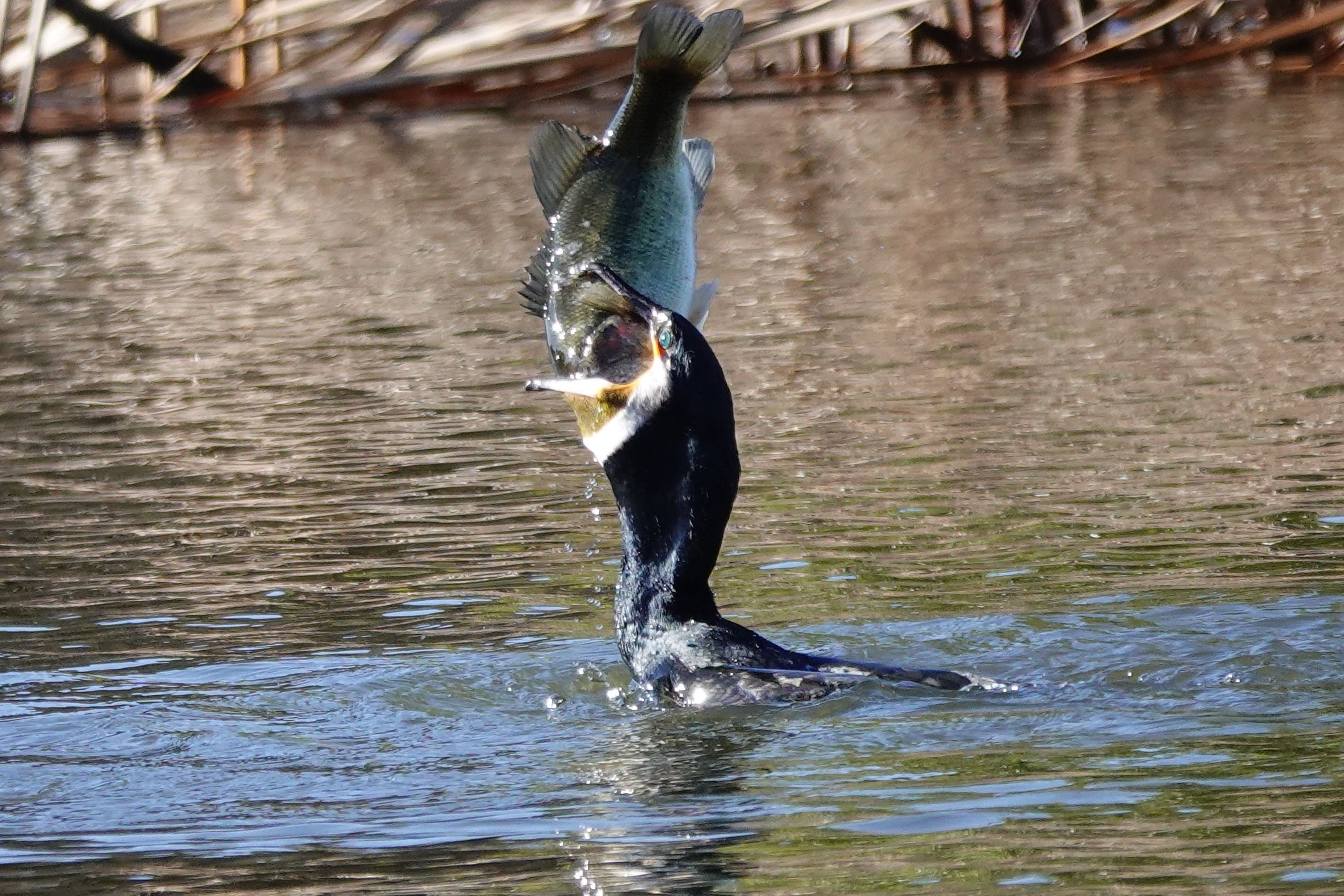 公園の池で#カワウ#がブラックバスを捕えて飲み込もうと必死ですが、ブラックバス も飲み込まれまいと暴れてます。魚はついに力尽いて#カワウ#の胃の中へ。