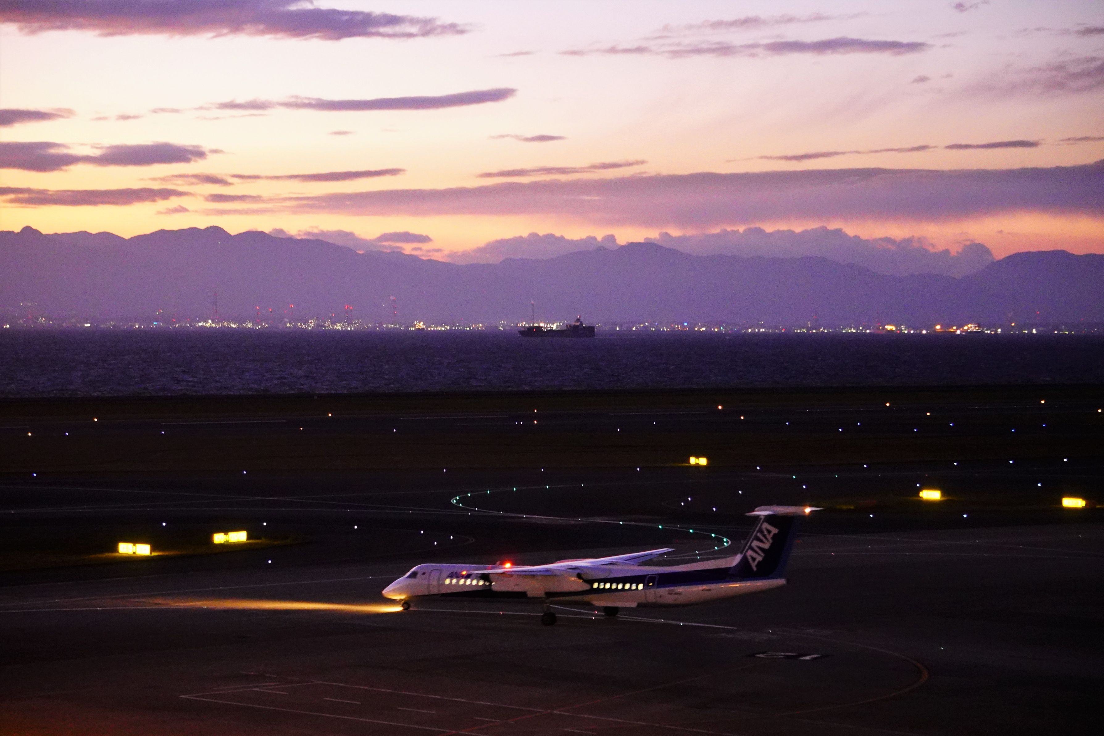 日が沈んで対岸の街に灯りがともり始めました。 刻々と変わる空の色がとても美しかった。 中部国際空港にて。