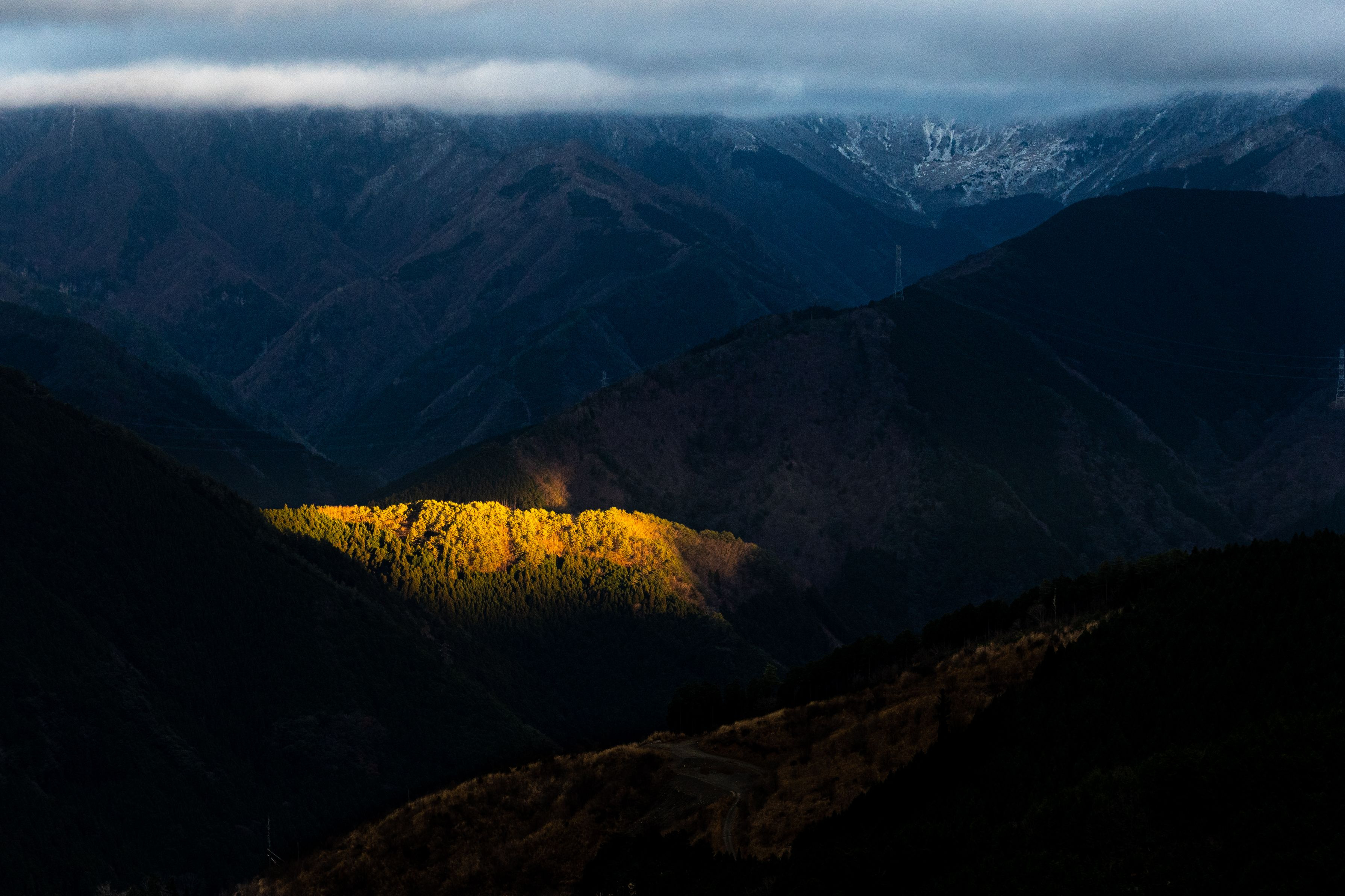 暗くなりつつある山影の一部に、夕日が届いて輝いているのが印象的でした。