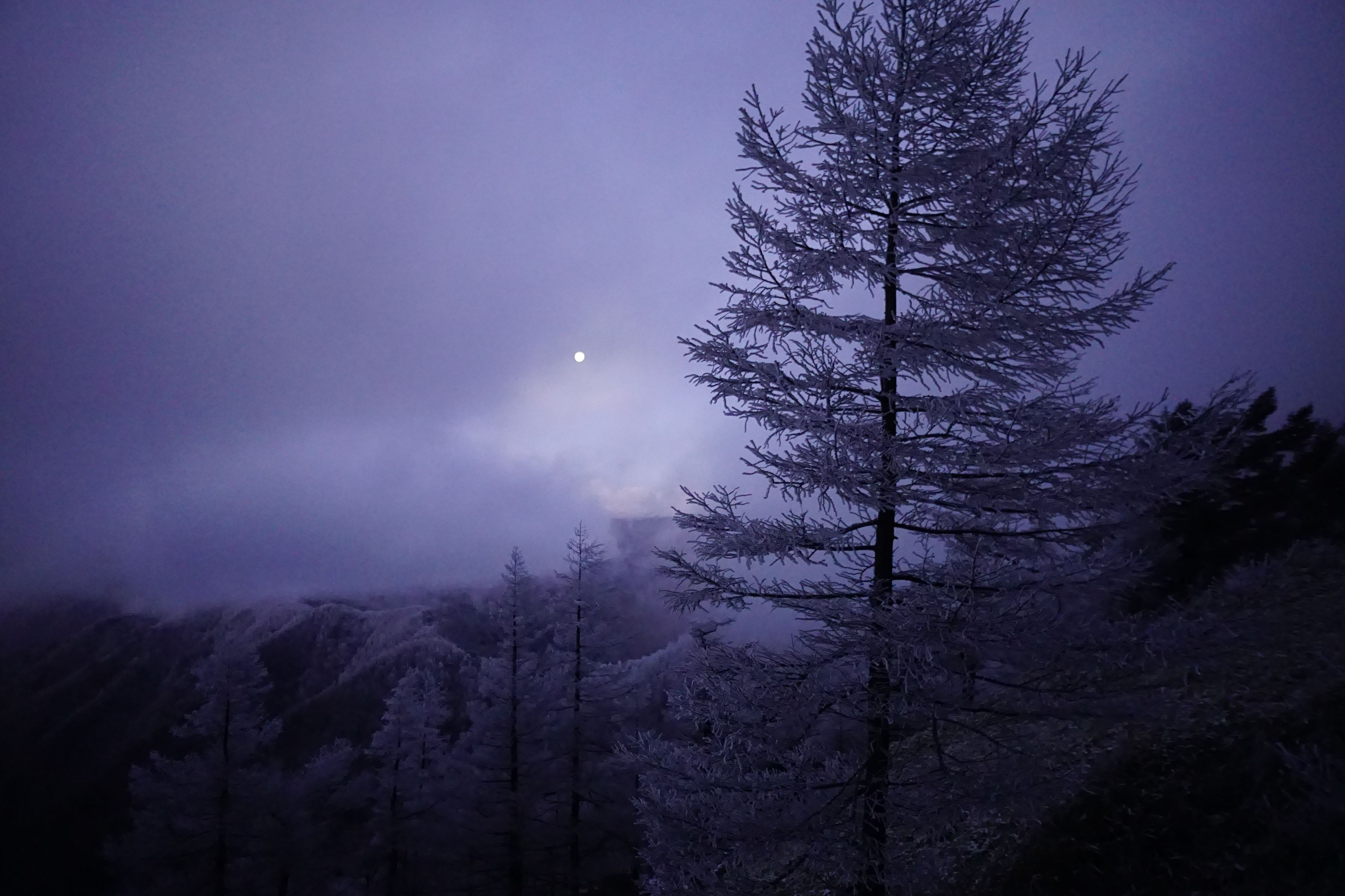 2018年、奥多摩小屋最後の冬に雲取山へ。 冬の霧氷と雲の中、日の出前の山頂に向かう途中で雲に隠れた沈みかけの月を見つけました。 白い樹、白い雲、減光の月明かりと遠くの景色。 まだ夜のままのような時間の中、日の出にいつも見る東ではなく、西の景色に惹かれました。
