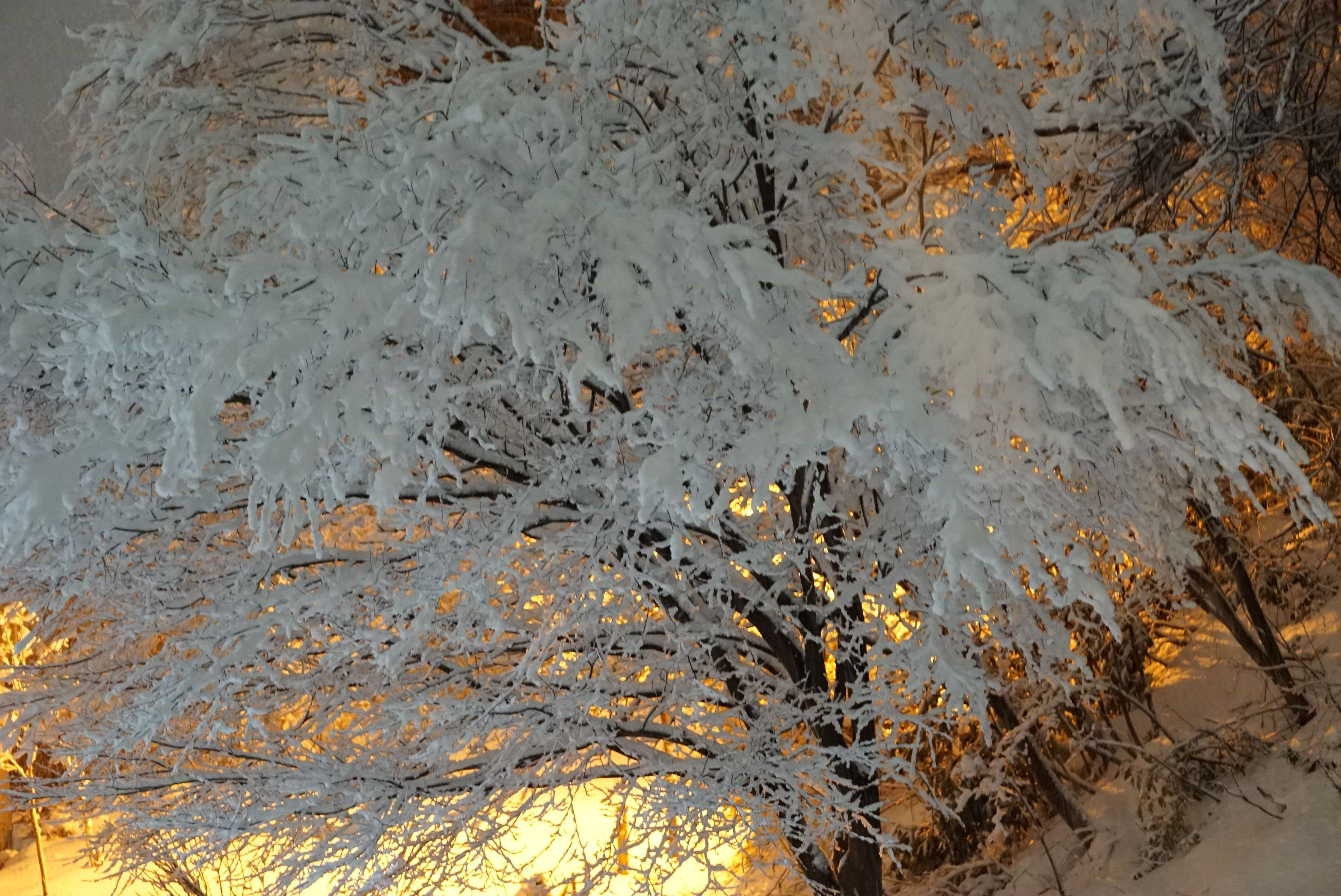 公園の欅の枝に積もった雪が照らされて,あたかも満開の夜桜のようです。