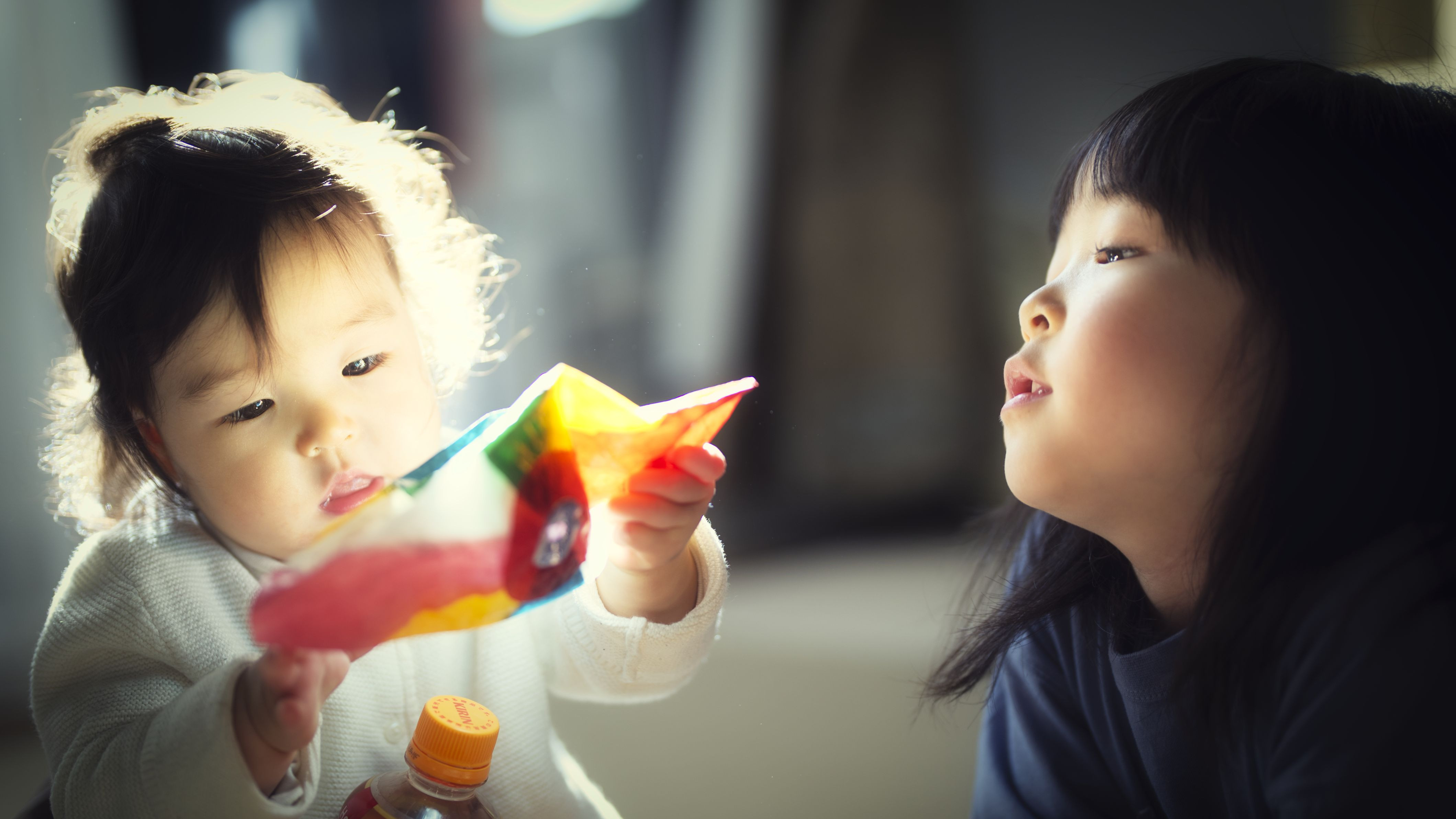 外は寒いので、家の中。初めて見る紙風船の遊び方がわからない。
