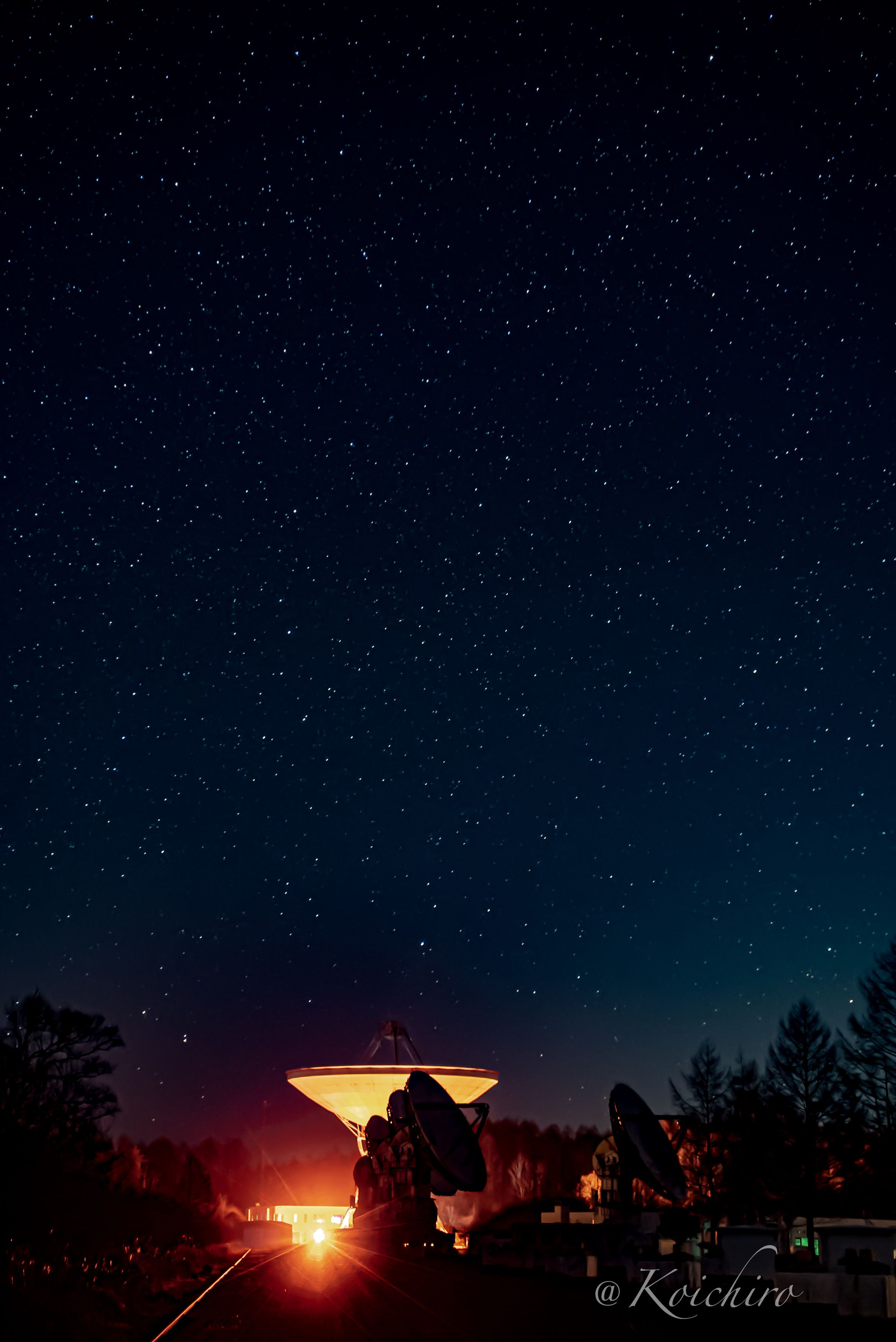 深夜の野辺山にある電波望遠鏡です。 電波望遠鏡が作動して観測しているときだけライトアップされます。