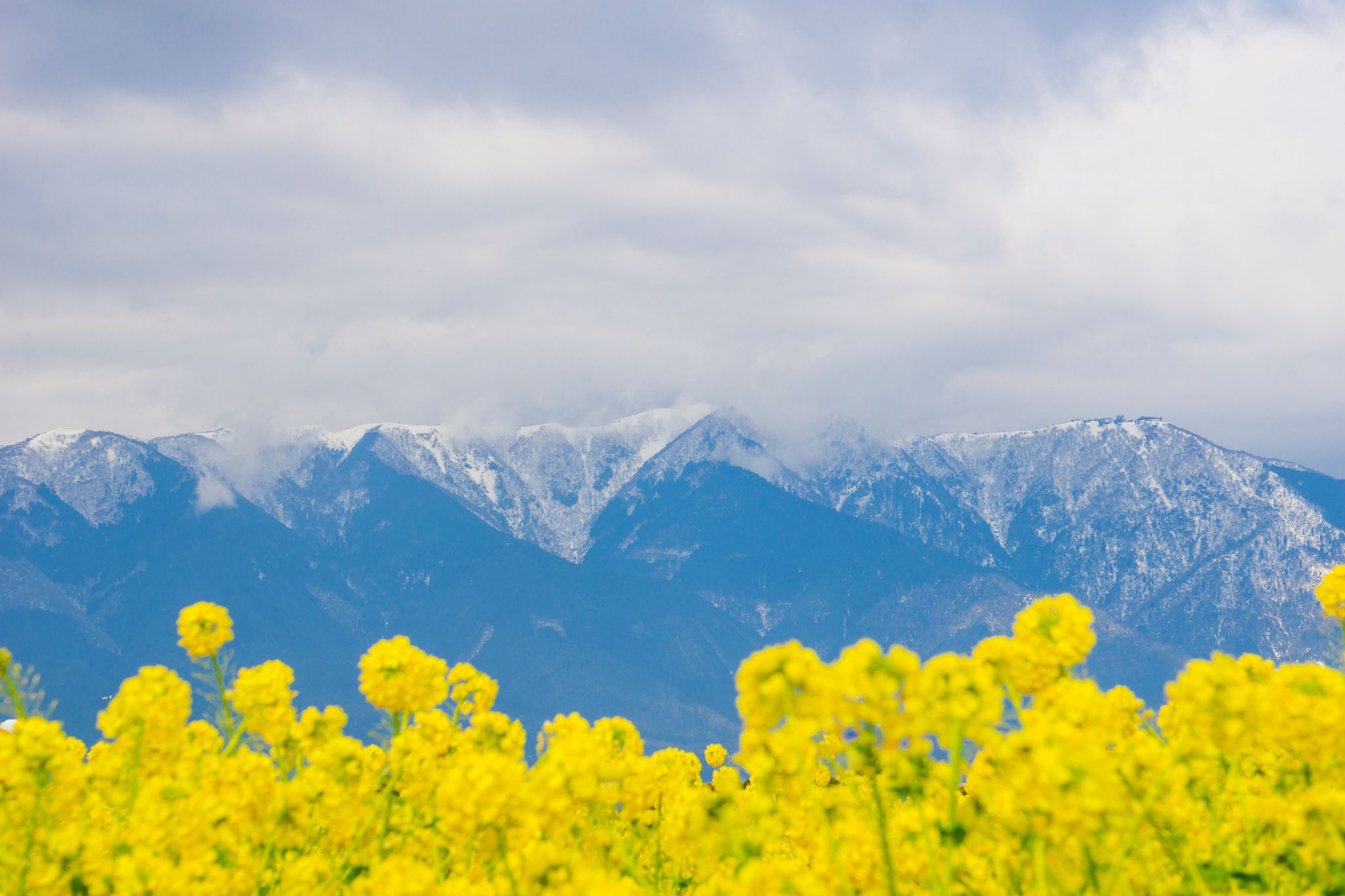 比良山系の雪景色と菜の花畑 生憎の曇り空
