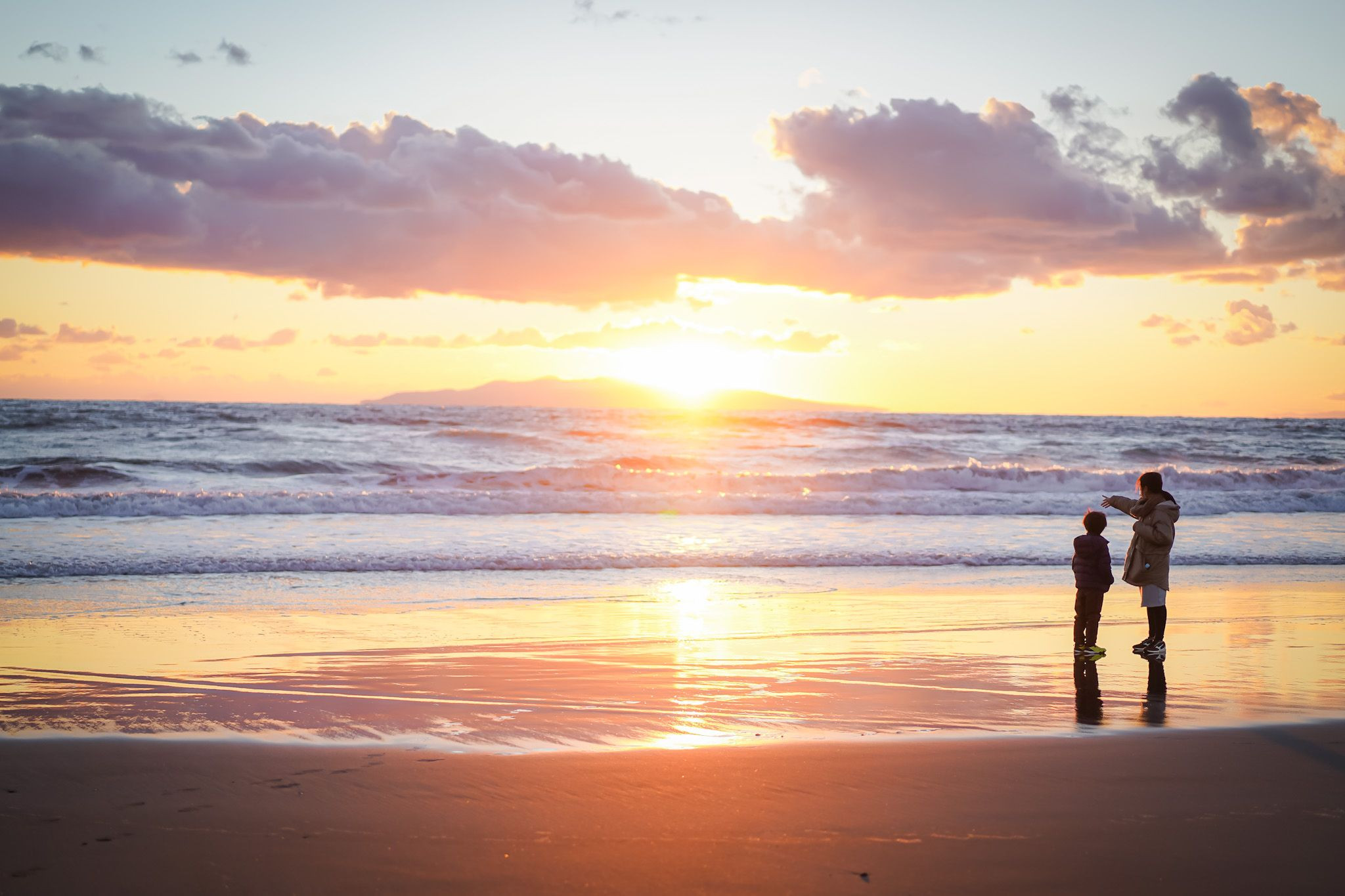 夕陽と海バックにキラキラな姉と弟