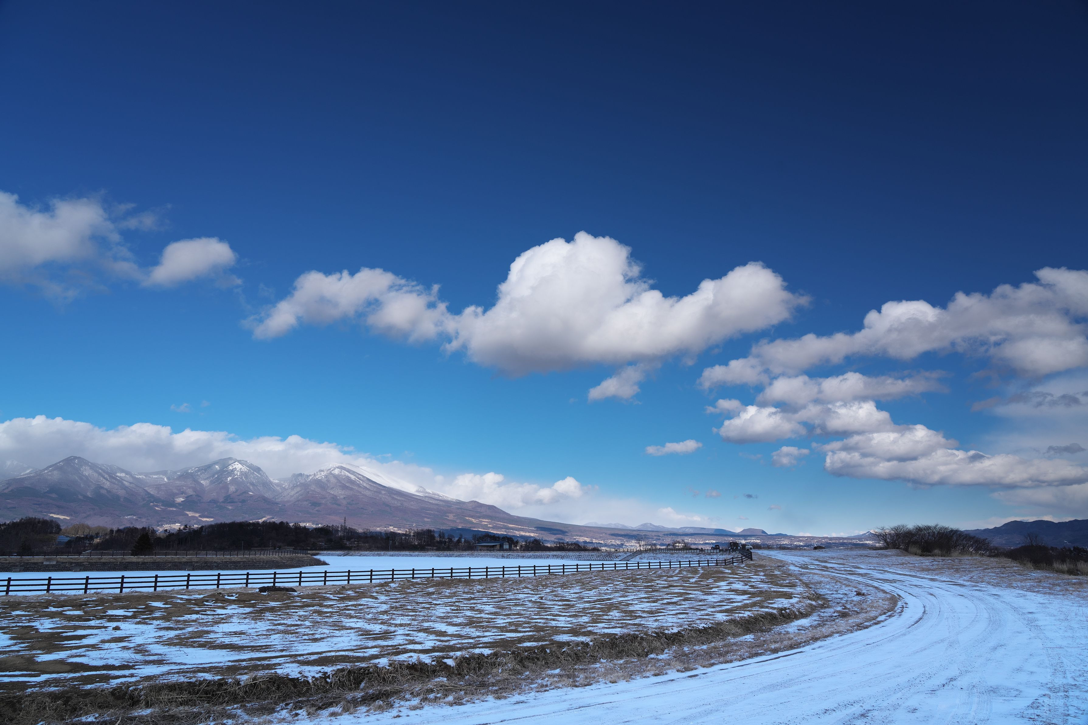 みまき大池に、うっすらと積もった雪と青空を撮影しました。 台地がアンダーだったので、補正してあります。 NDハーフフィルタを持っていけば良かったのですが。
