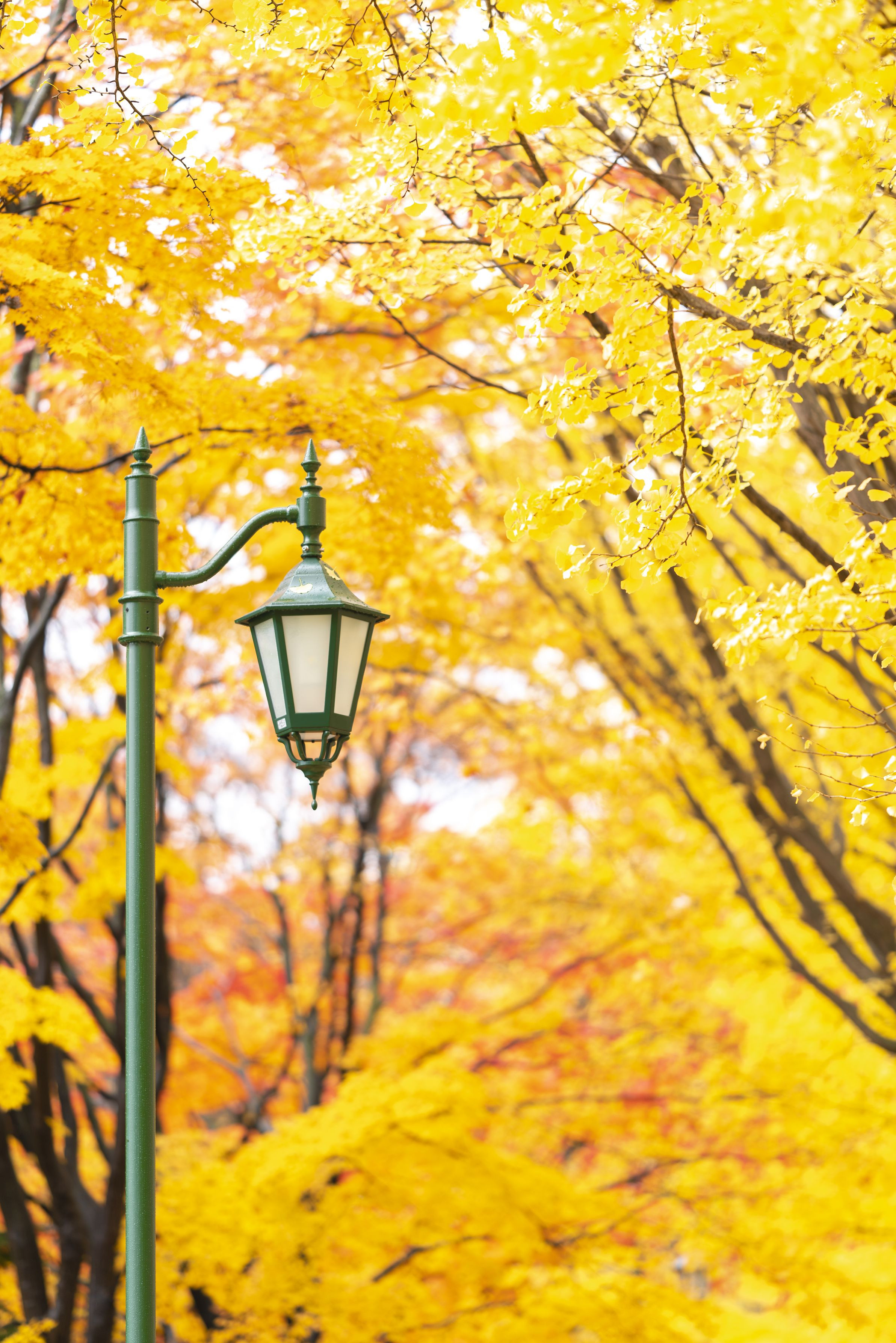 銀杏並木に合わせた緑の街灯