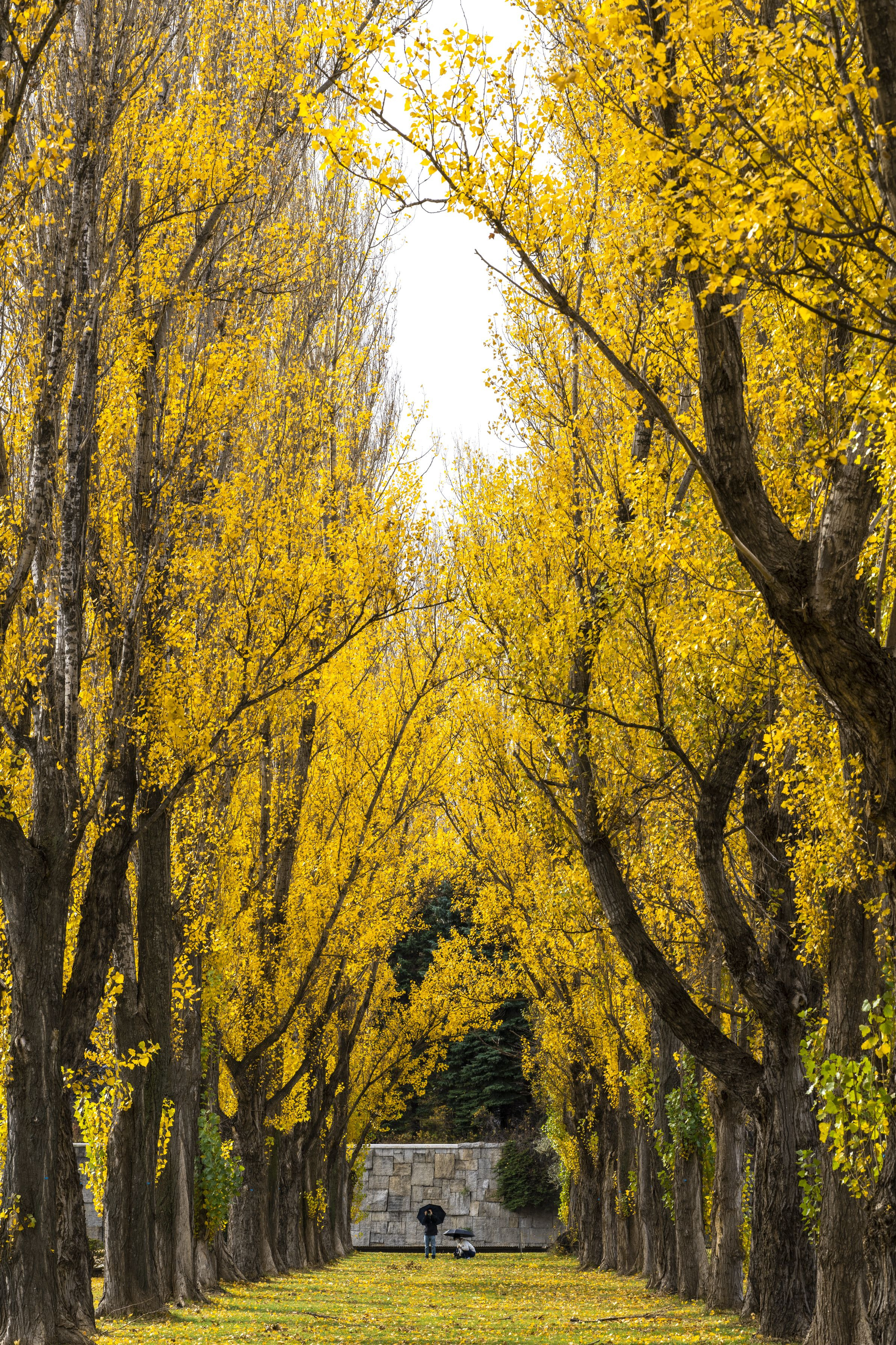 ポプラ並木の紅葉を撮影するカメラマン