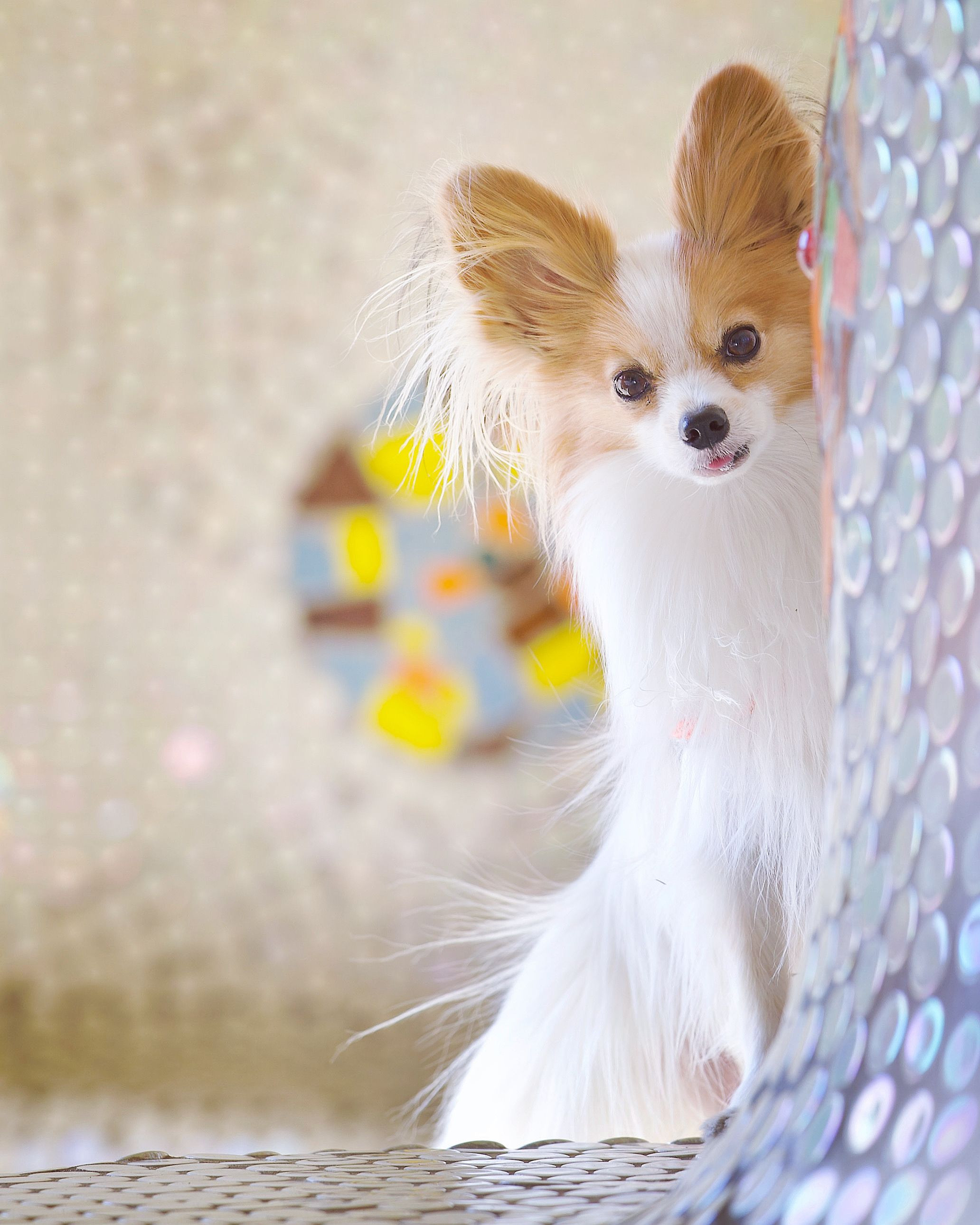 可愛いタイルのベンチでひょっこりなきらきらべべです