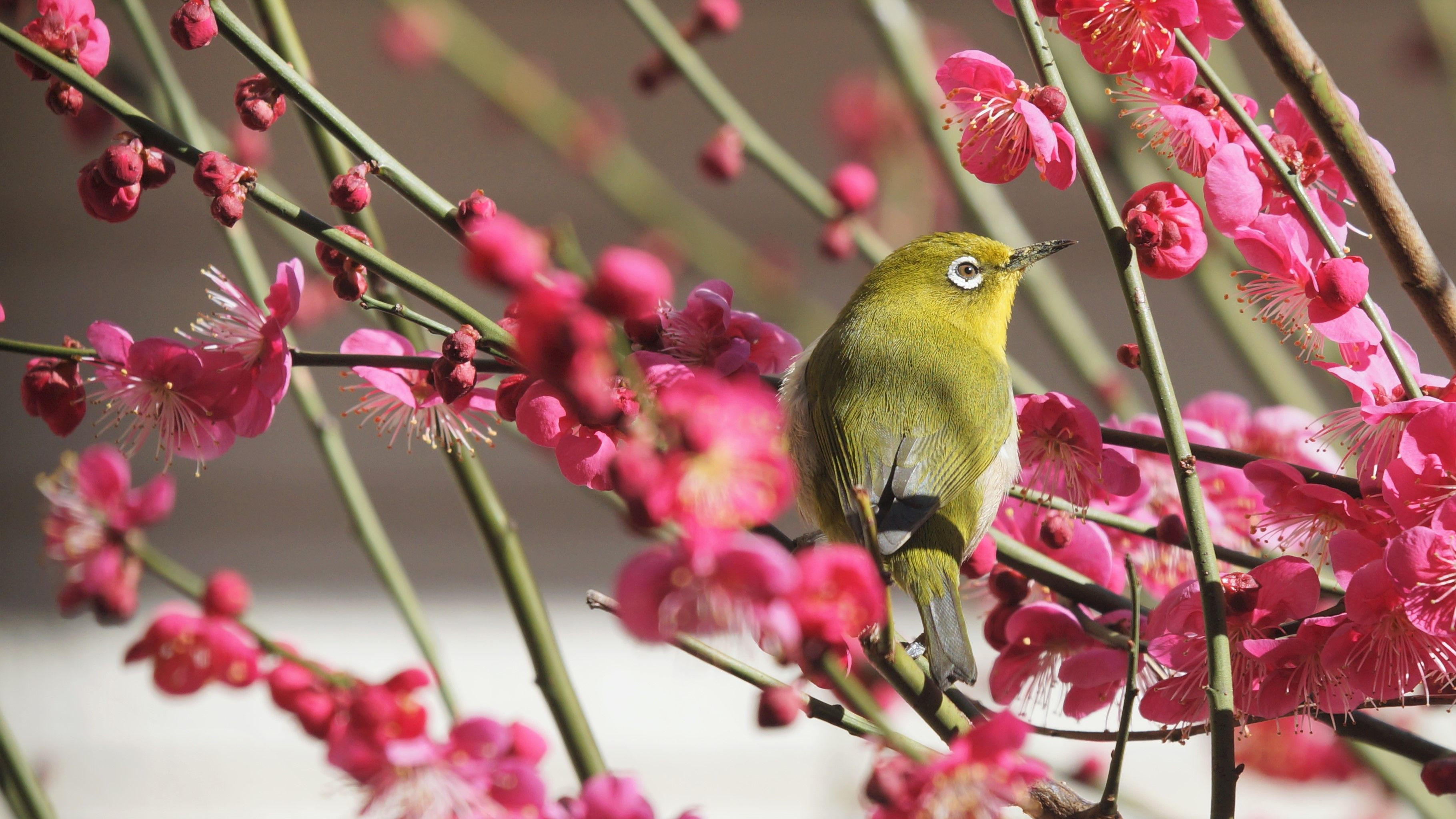 よく見かけるメジロさんです 我が家の梅の花蜜を吸いに来たところをパチリ