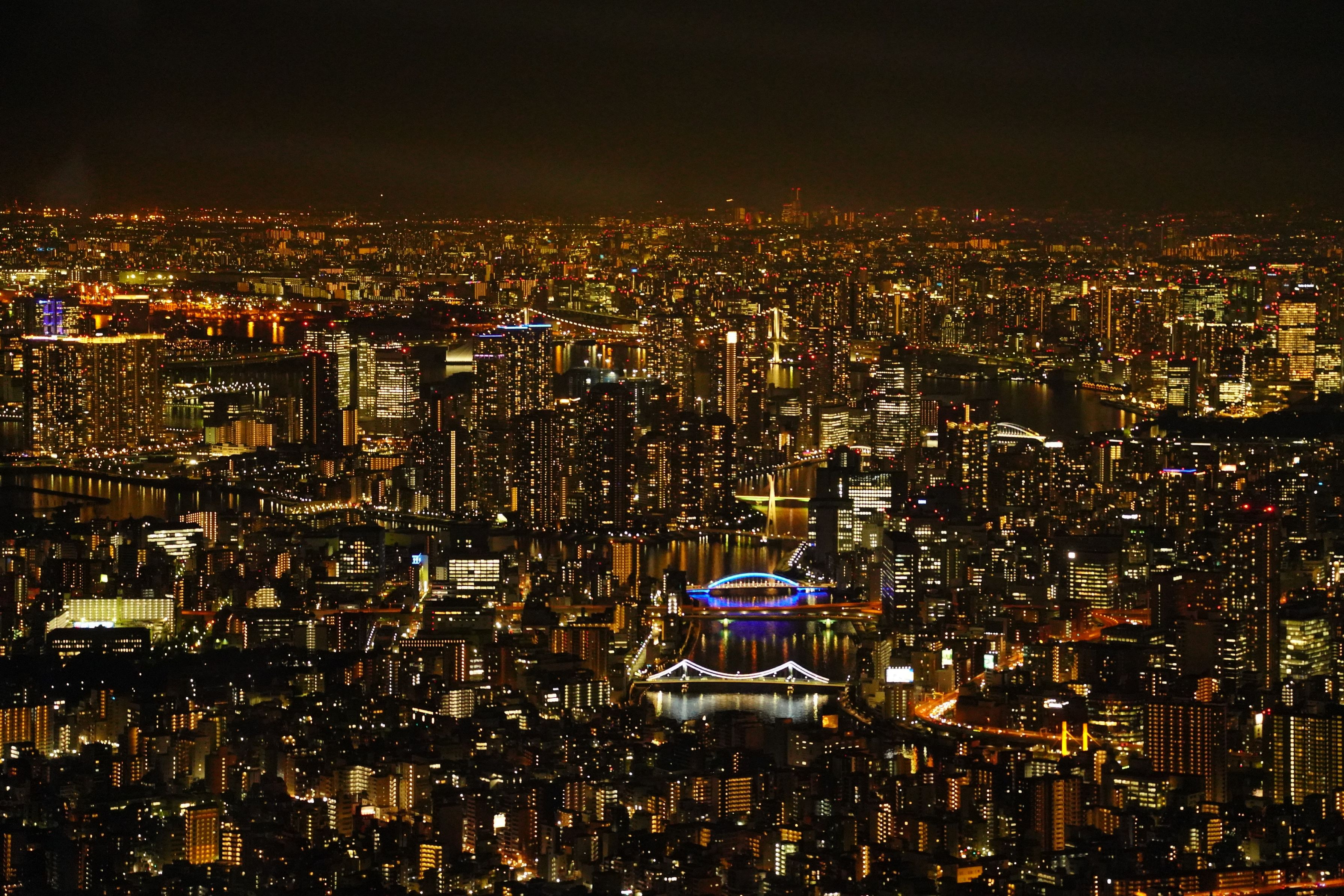 品川方面の夜景です。 清洲橋、隅田川大橋、永代橋、中央大橋、遠くにレインボーブリッジ