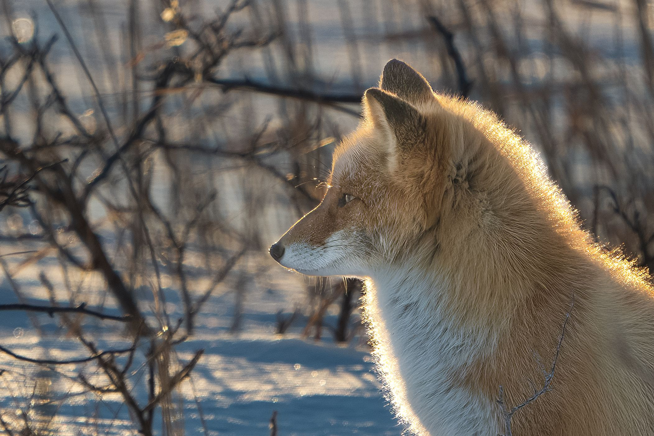 野付半島のキタキツネさん。 ふわふわの冬毛が美しく輝いていました。