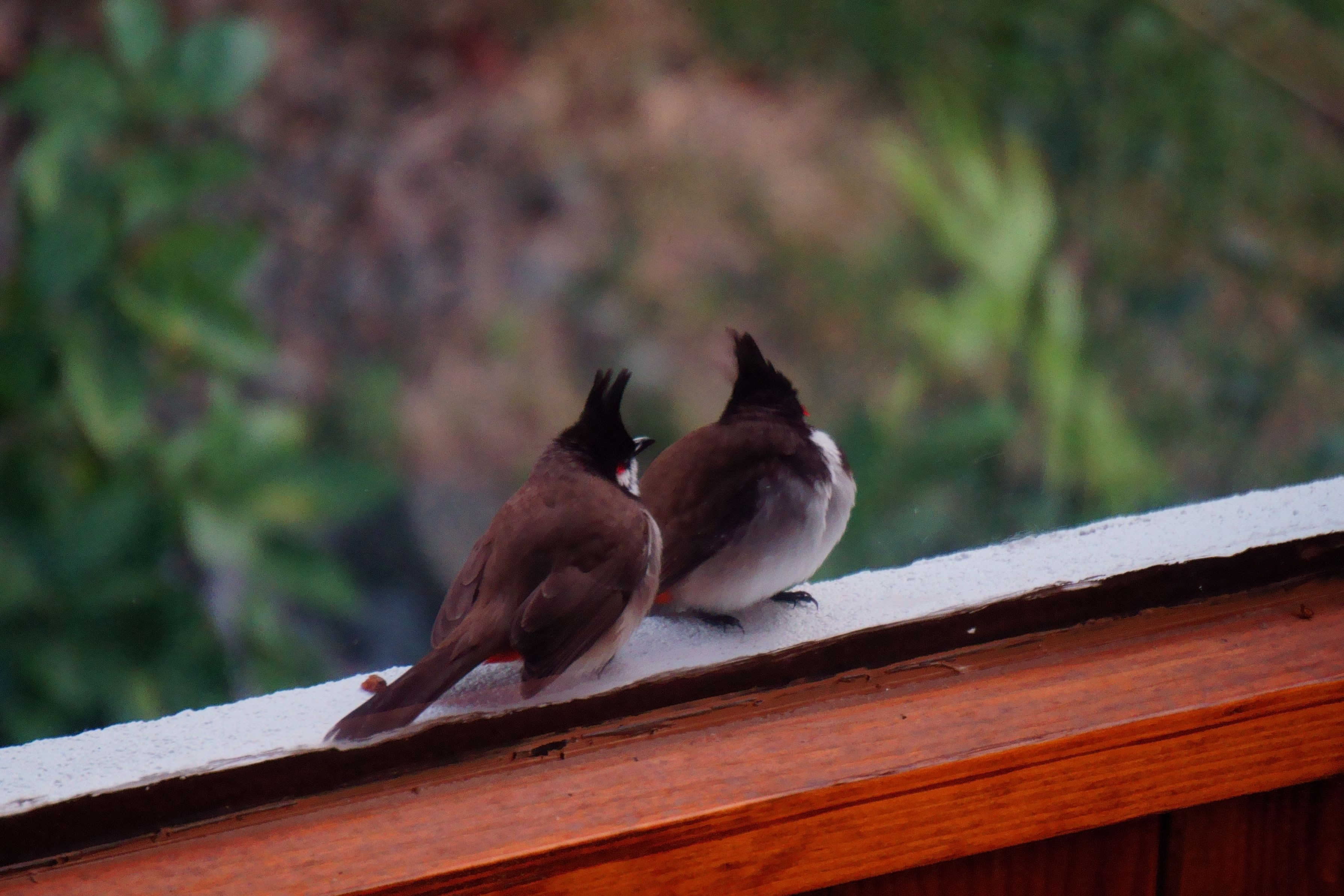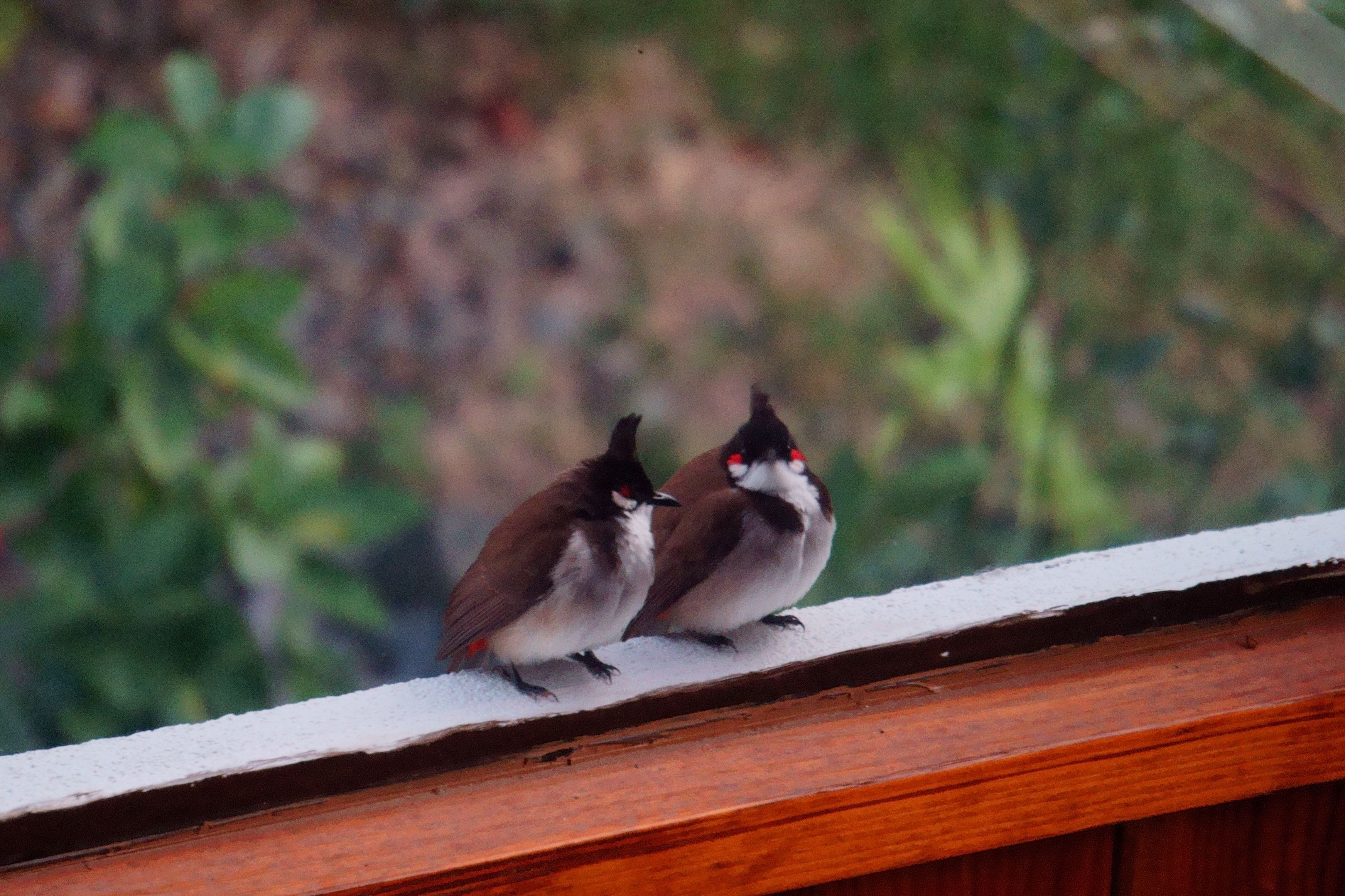 階段の窓辺に小鳥が二羽やってきました。そーっとカメラを取りに戻るとまだ窓辺にいたので撮影できました。名前がわからないので検索したところ紅羅雲(こうらうん・Red-whiskered Bulbul)のようです。生まれて初めて見ました。(以前は気が付かなかっただけかもしれません。。)(トリミングあり) #紅羅雲#