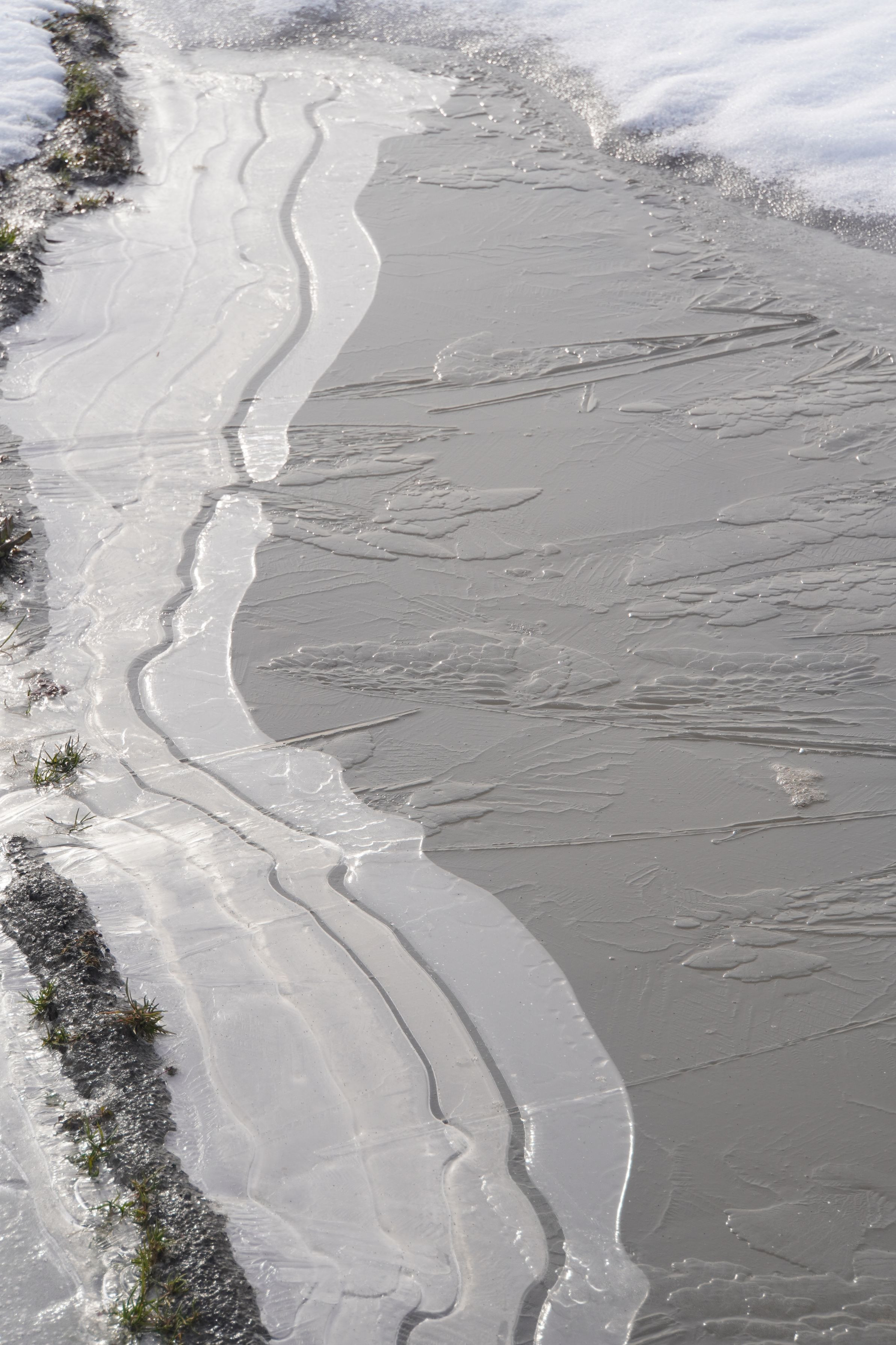 田の水が凍っていました。氷と水との隙間が模様を描いてくれました。まるで2匹のウナギが顔を突き合わせているように見えませんか?