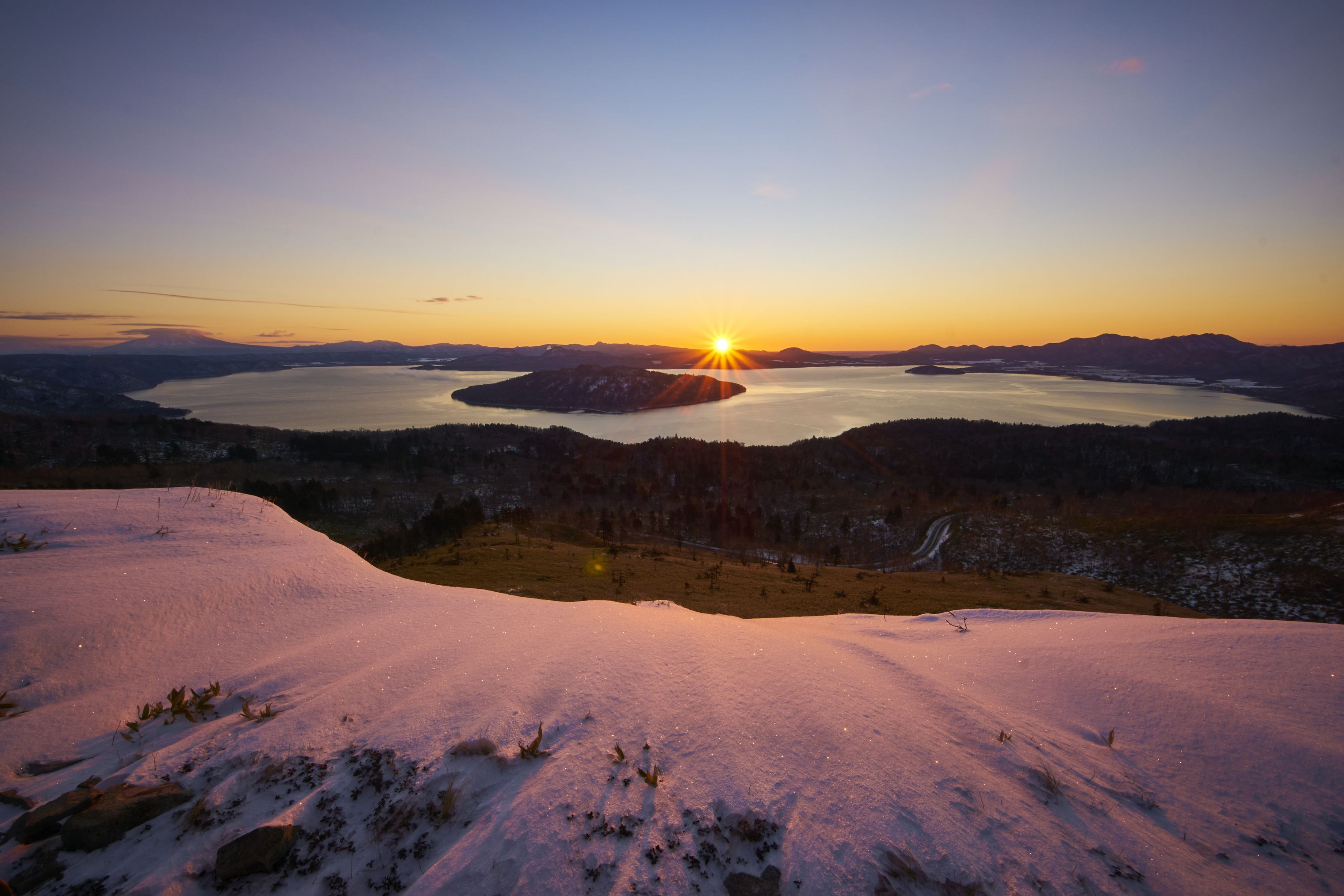 屈斜路湖の中島から昇る朝日! 美幌峠の朝日とシュカブラ(雪紋)を撮影したかったのですが、この時期はまだ積雪が少なかったようです。 (ロコ・ソラーレ カーリング銀メダル!おめでとうございます!)