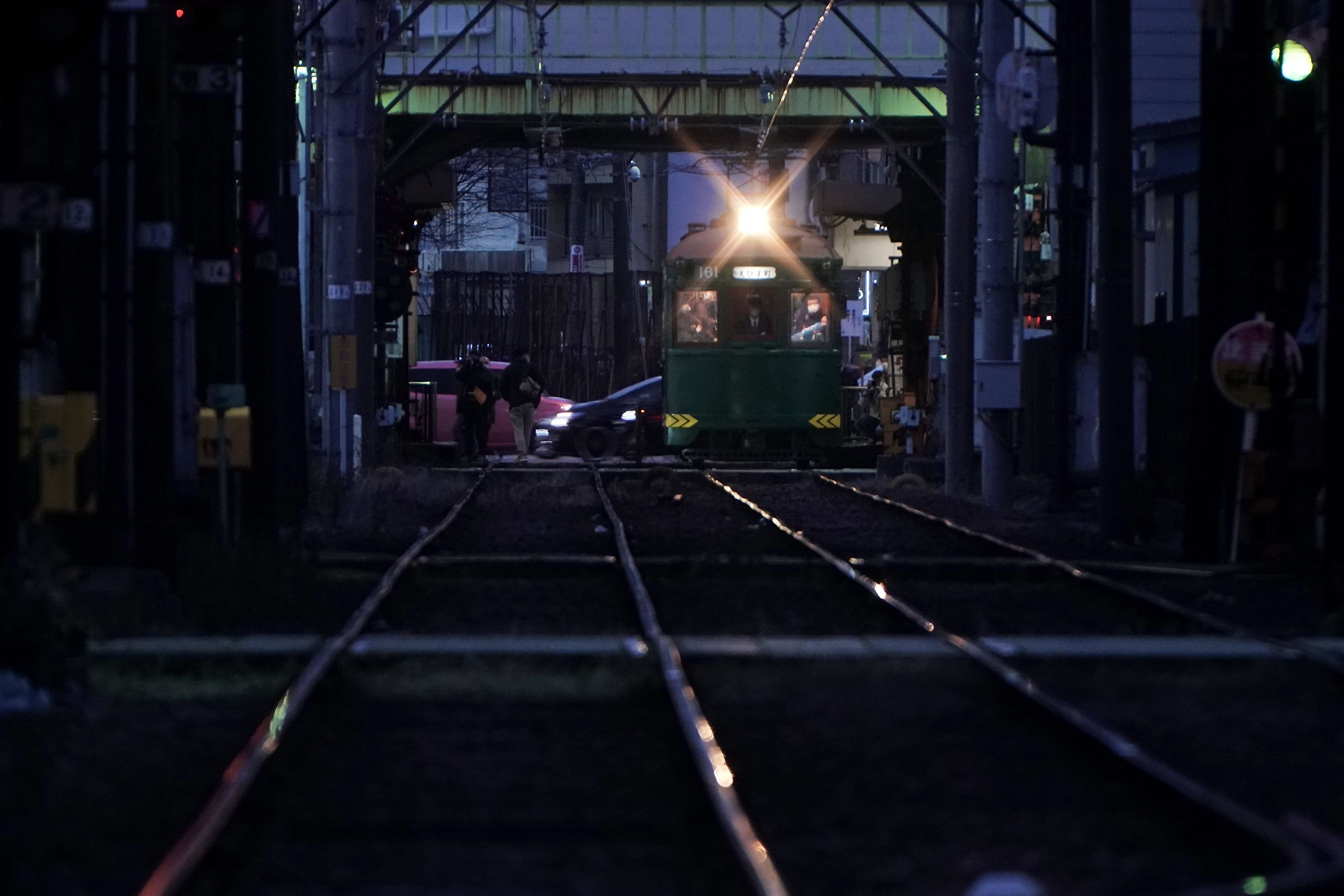 かなり暗い環境でしたが無理矢理撮ってみたところ、ヘッドライトがなかなか雰囲気よく写ってくれました。 月末まで定期運行中の阪堺モ161号です。