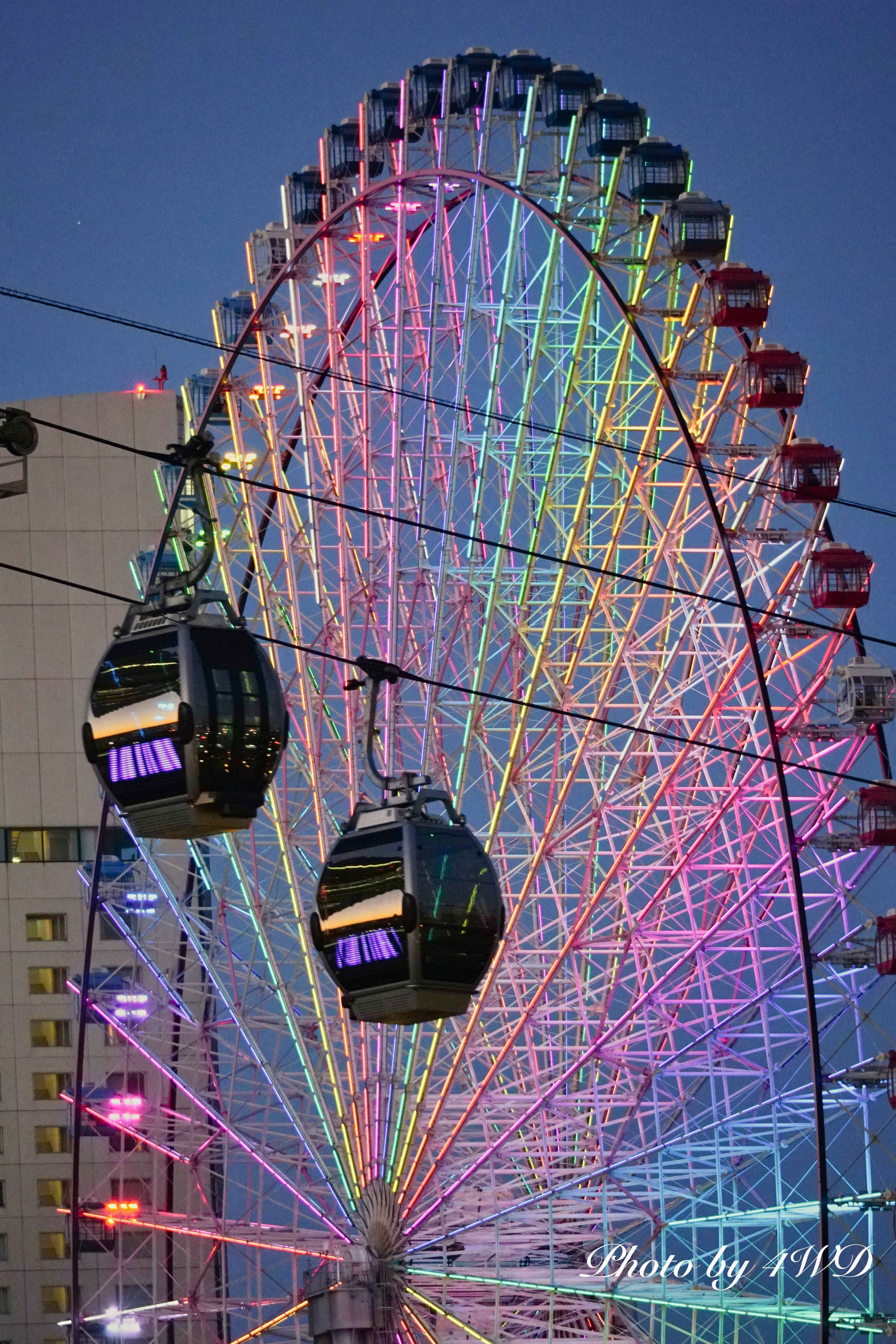 ブルーアワーのコスモクロックを背景に横浜エアキャビンを撮りました。