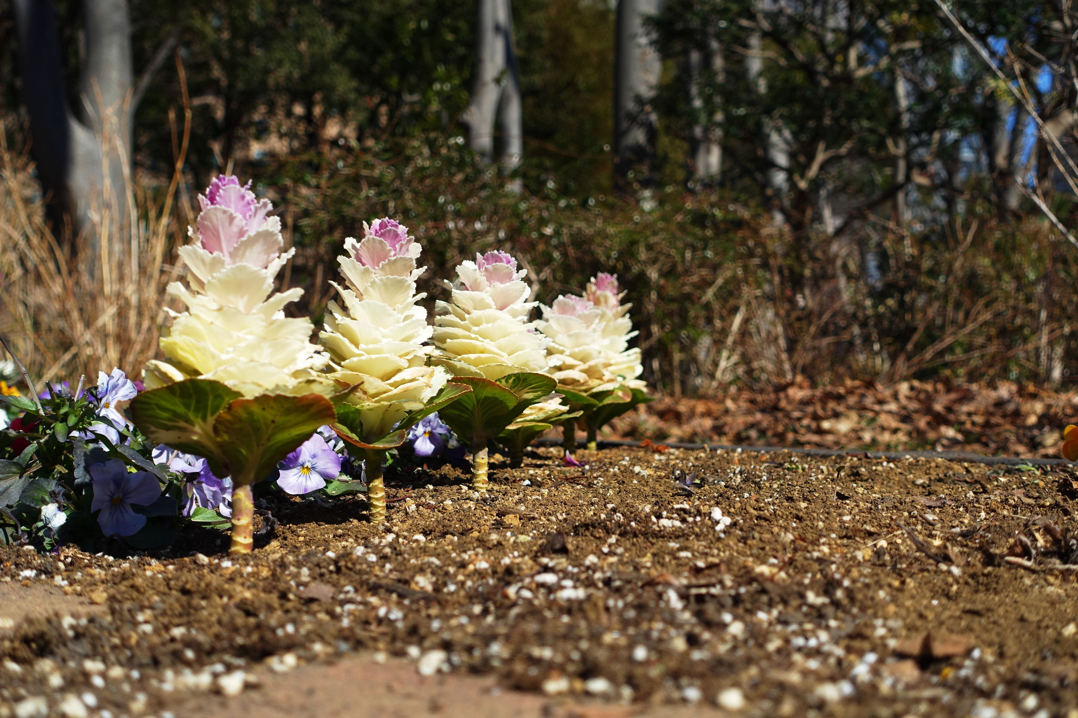 公園の花壇に植わっていた葉ぼたんと思われるもの。 なんだか街路樹のように一列になってました。