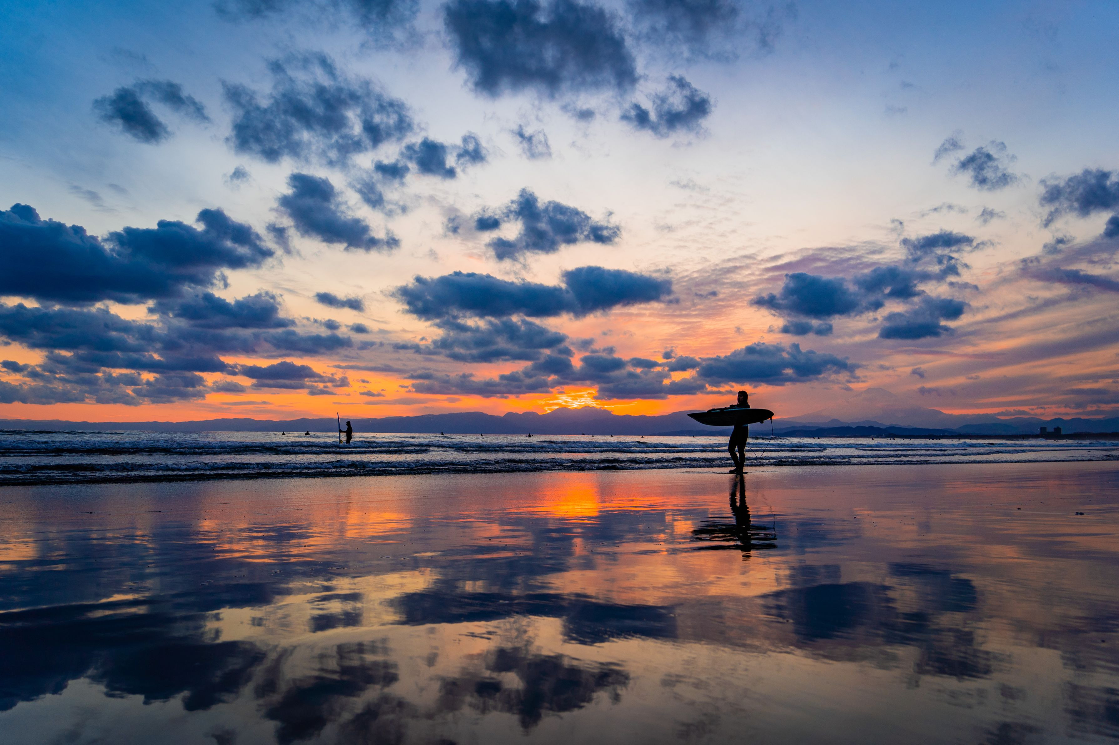 湘南にて。 遠浅の海岸なので、波が引くと空を反射して美しい景色を見ることができた。