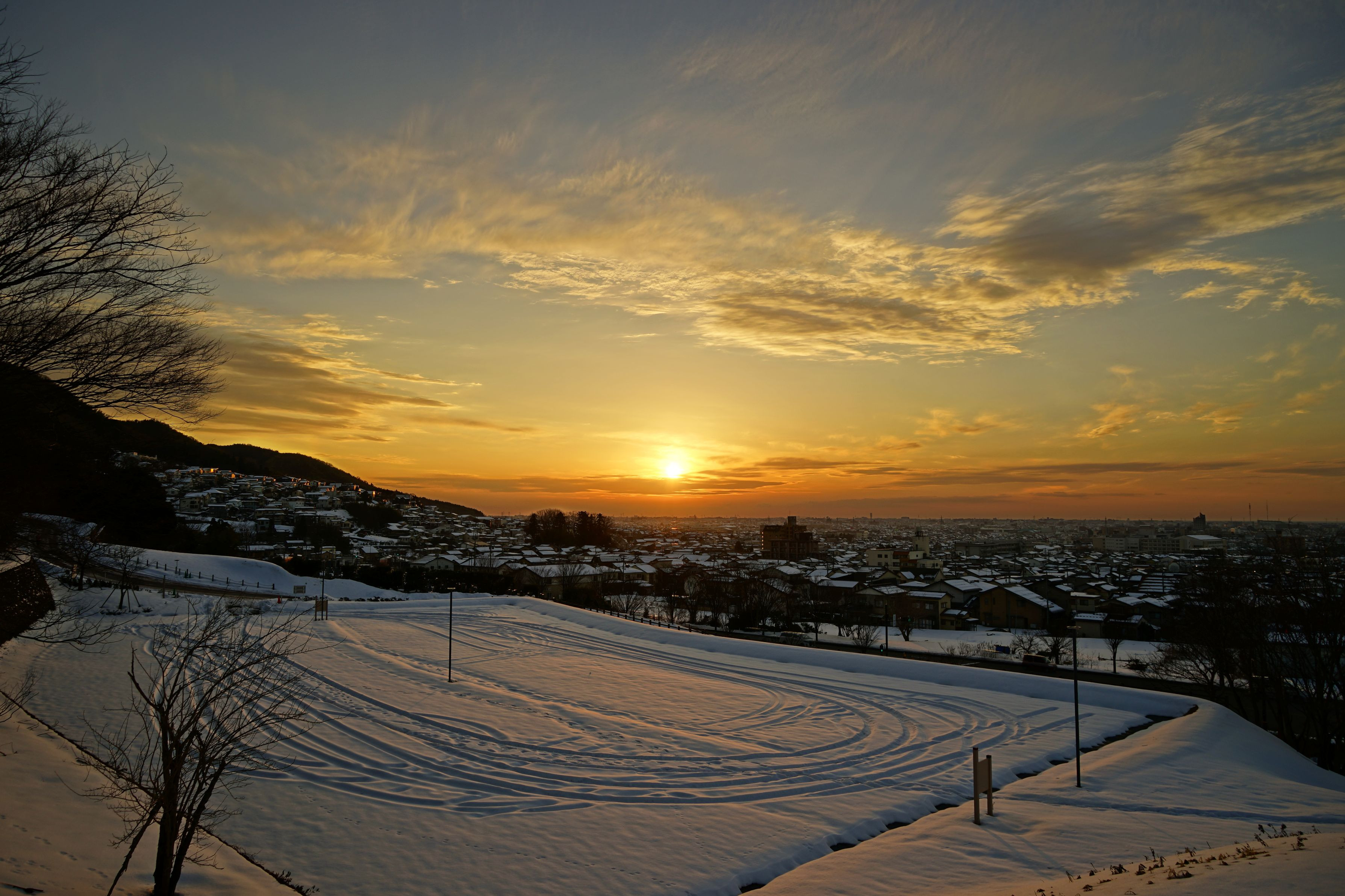 夕陽に映える雪積もる金沢市街。この轍から抜け出せる時が来るのだろうか。