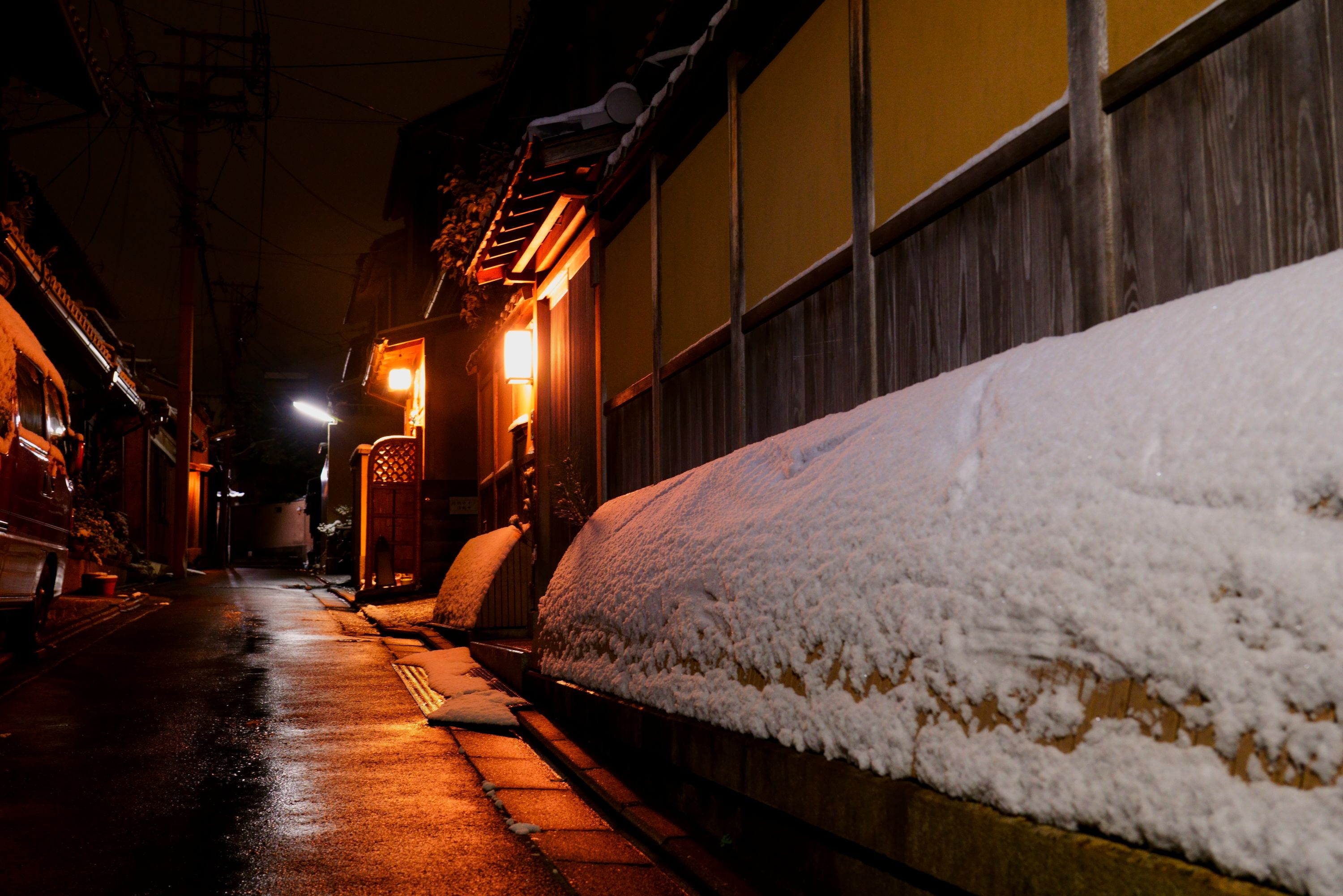 5時48分 犬矢来に積もった雪が印象的でした 正門からねねの道へ行く途中の脇道 撮影禁止エリアの石塀小路とは違う場所です