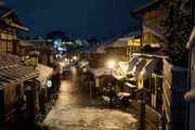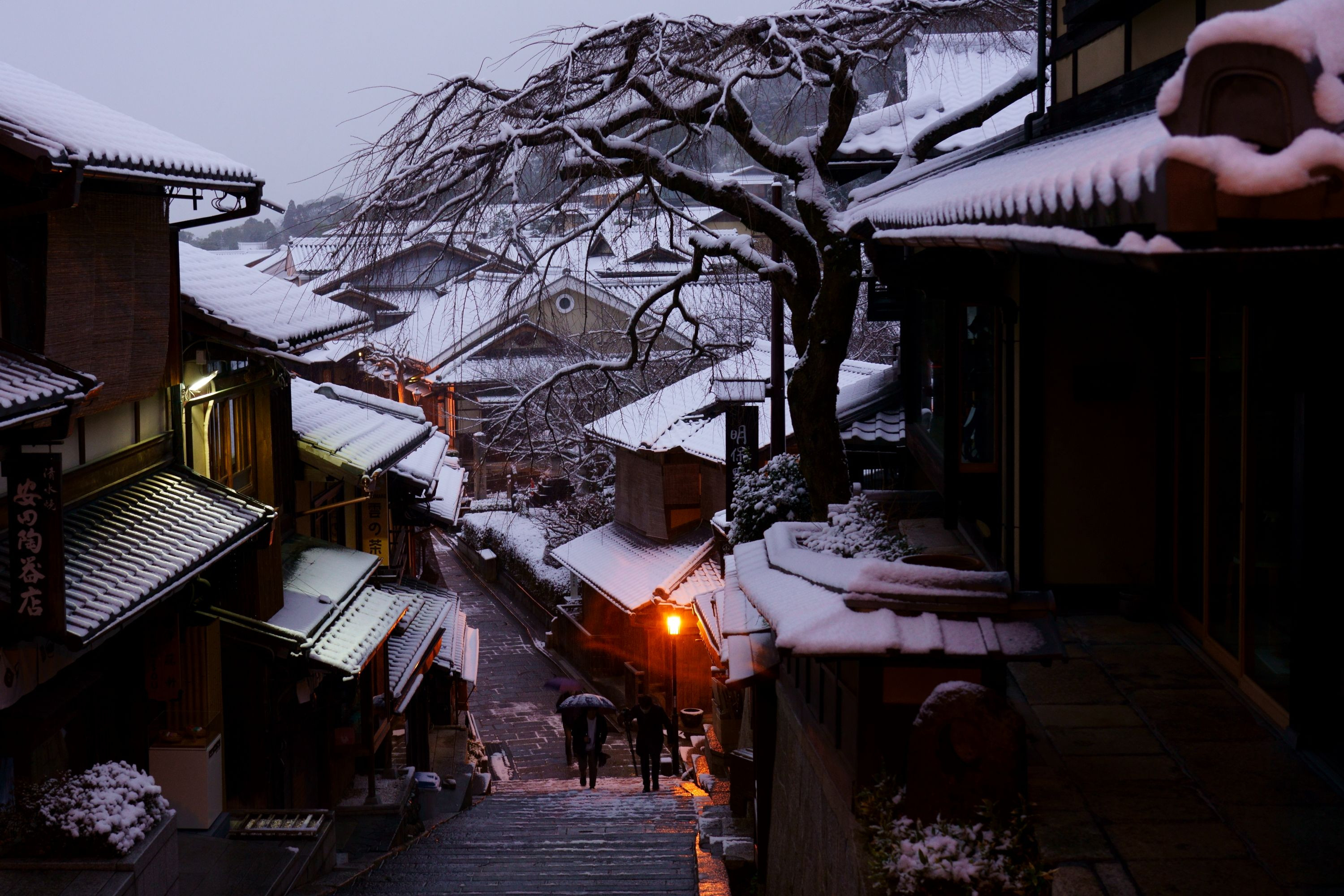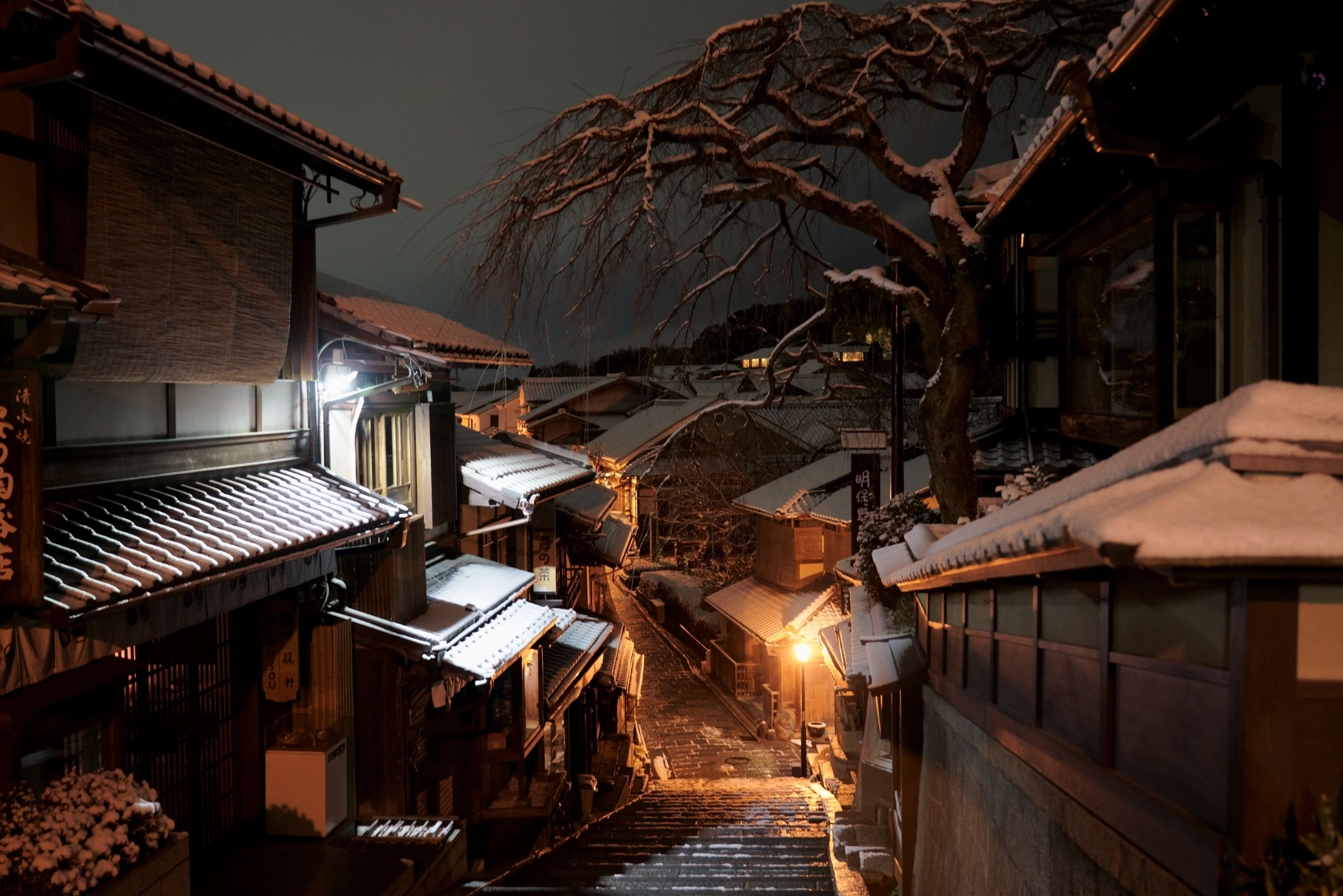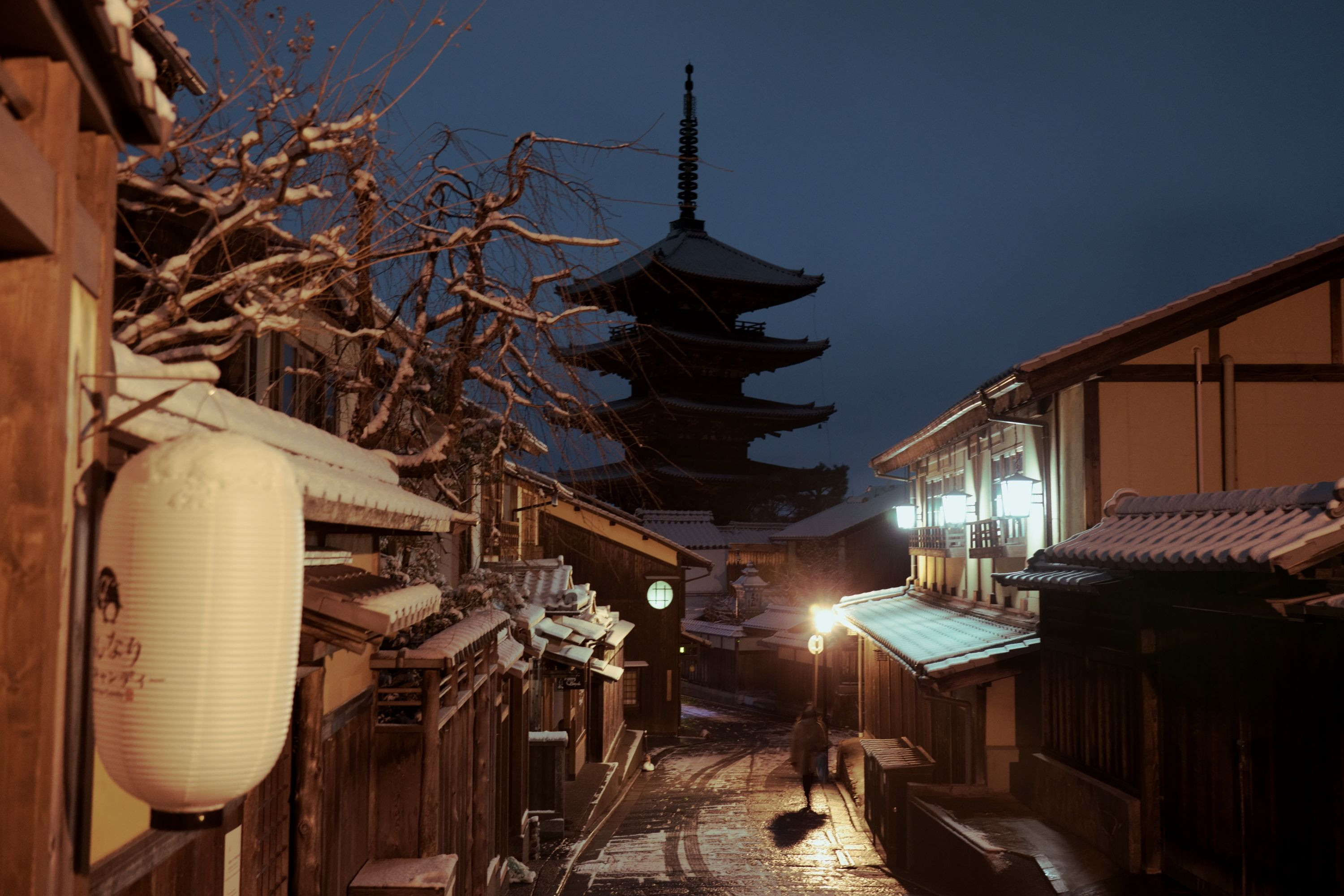 5時58分 雪が止んだ二寧坂 三脚で構える先客の横で撮りました 手ブレ補正の限界を越えていたようです
