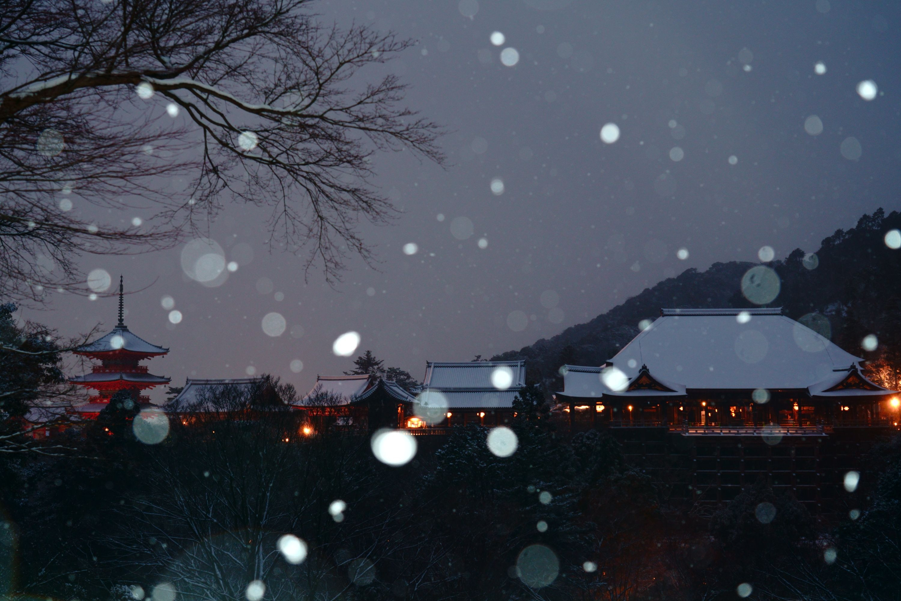 6時30分 清水寺の舞台を正面に望む子安の塔側から 少し明るくなるのを待つあいだに雪が降って来たのでフラッシュを使用