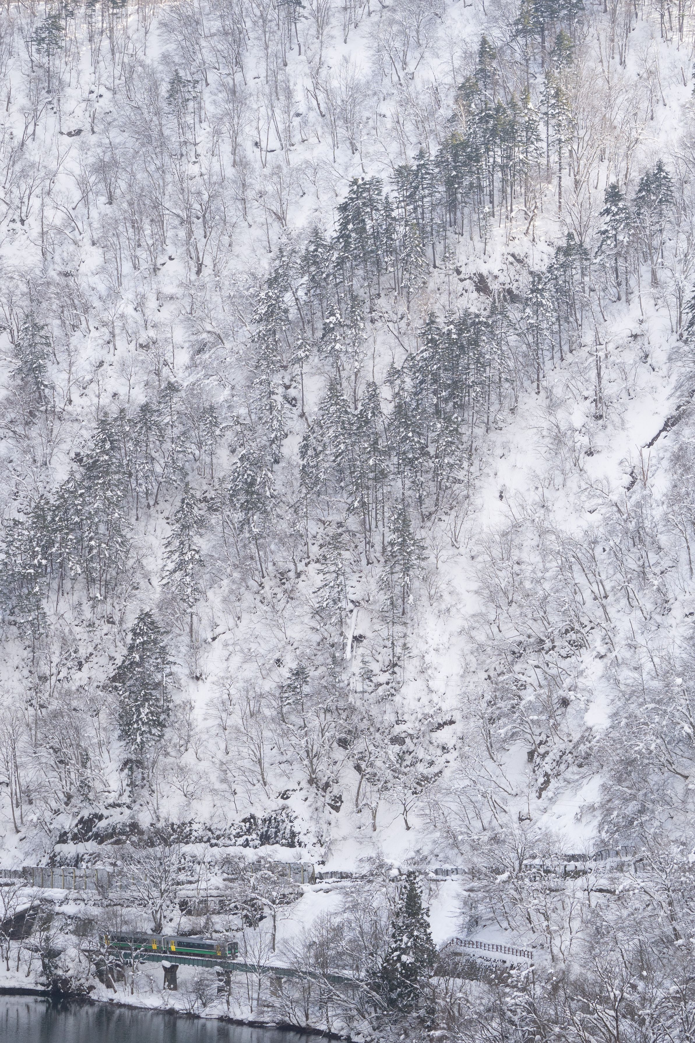 雪化粧したモノトーンの山を背景に列車が走っています まるで雪の壁が列車に襲いかかってるようにも見えます