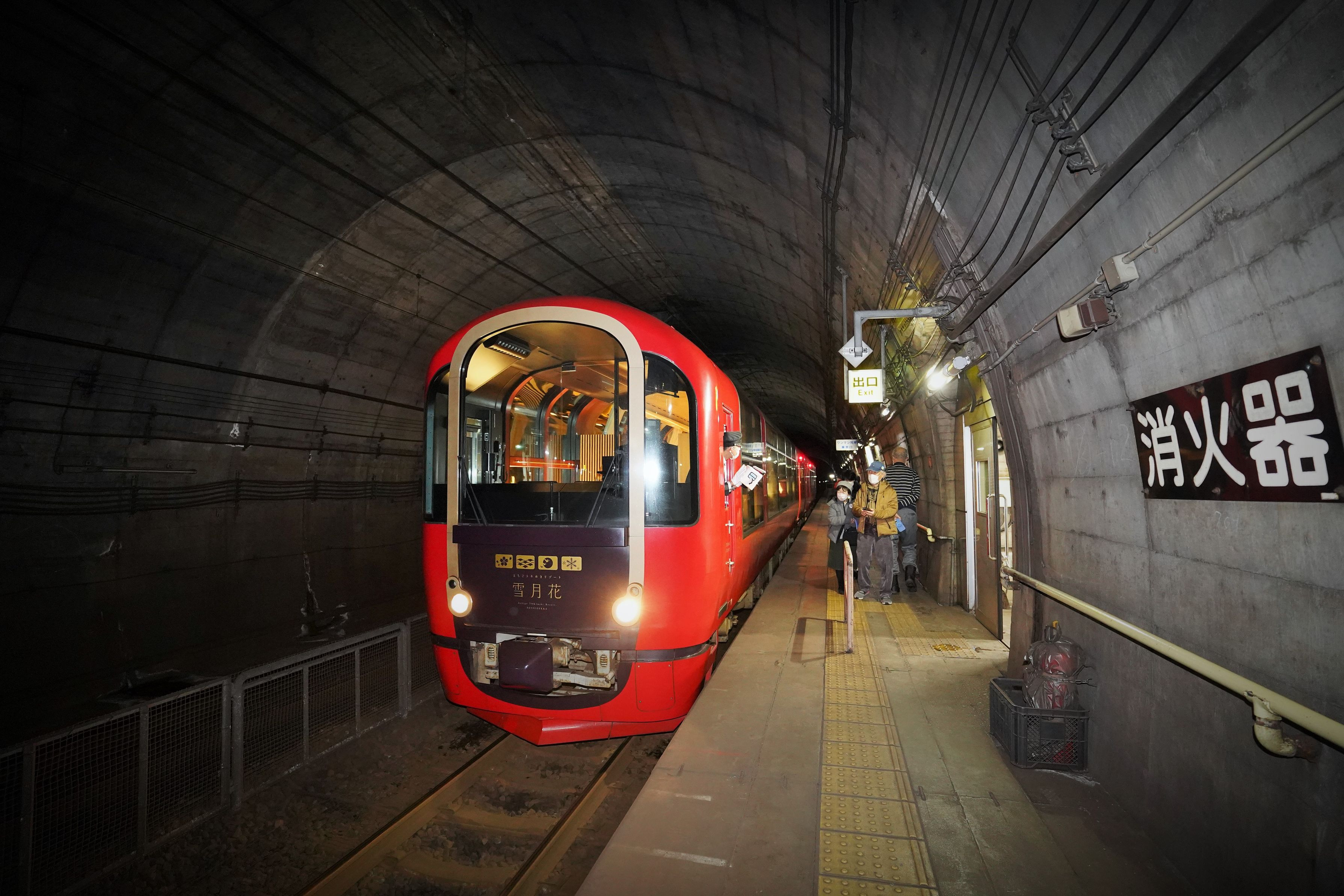 日本海ひすいラインの筒石駅に停車する「雪月花」です。全国で5ケ所しかないトンネル内の駅です。
