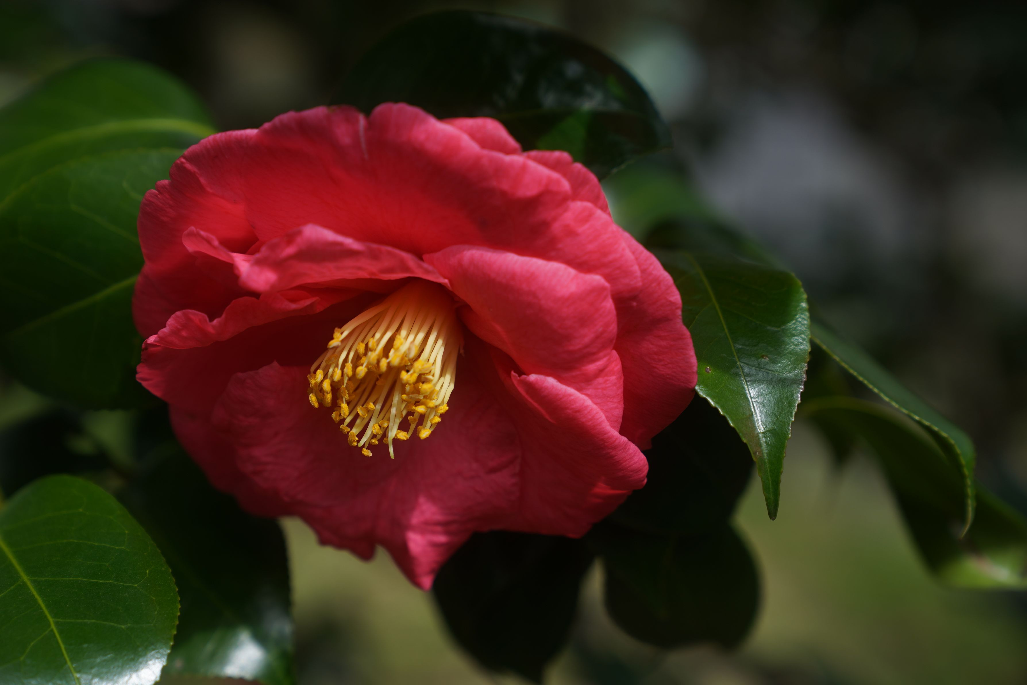 いい天気の中。大きなツバキの花を見つけました。 鮮やかな緑の葉っぱの中に、目立つ真っ赤な花が咲いていました。 思わず撮影しました。