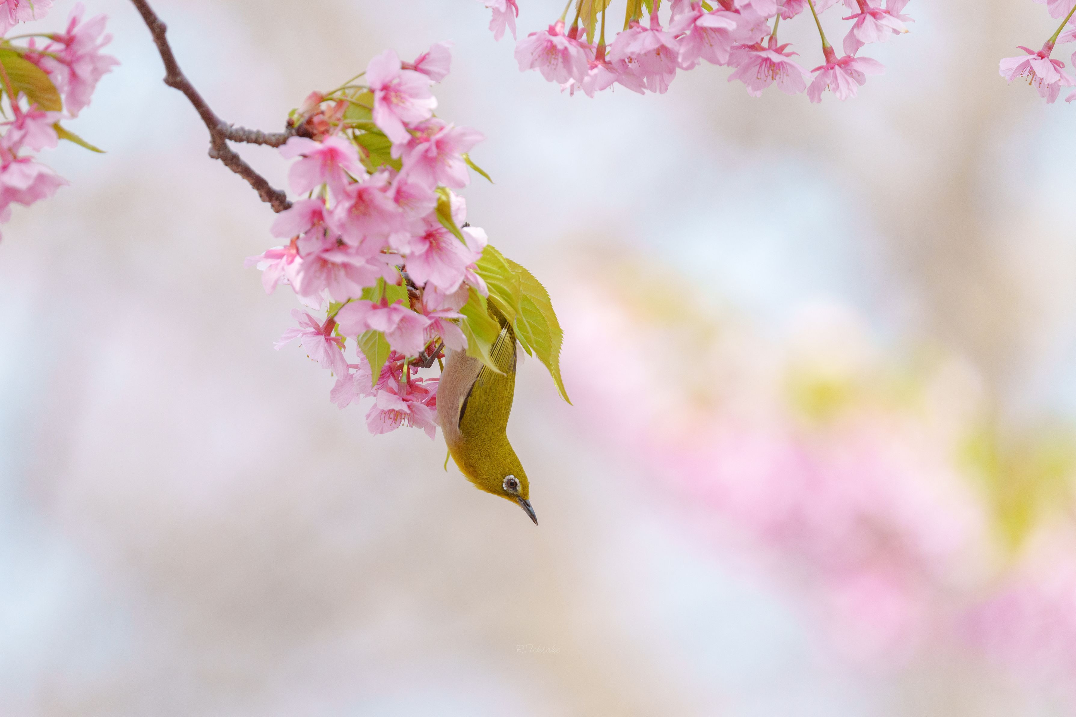 満開の河津桜に目白押しだった#メジロ# 桜の若葉とこんなに似ているとは!