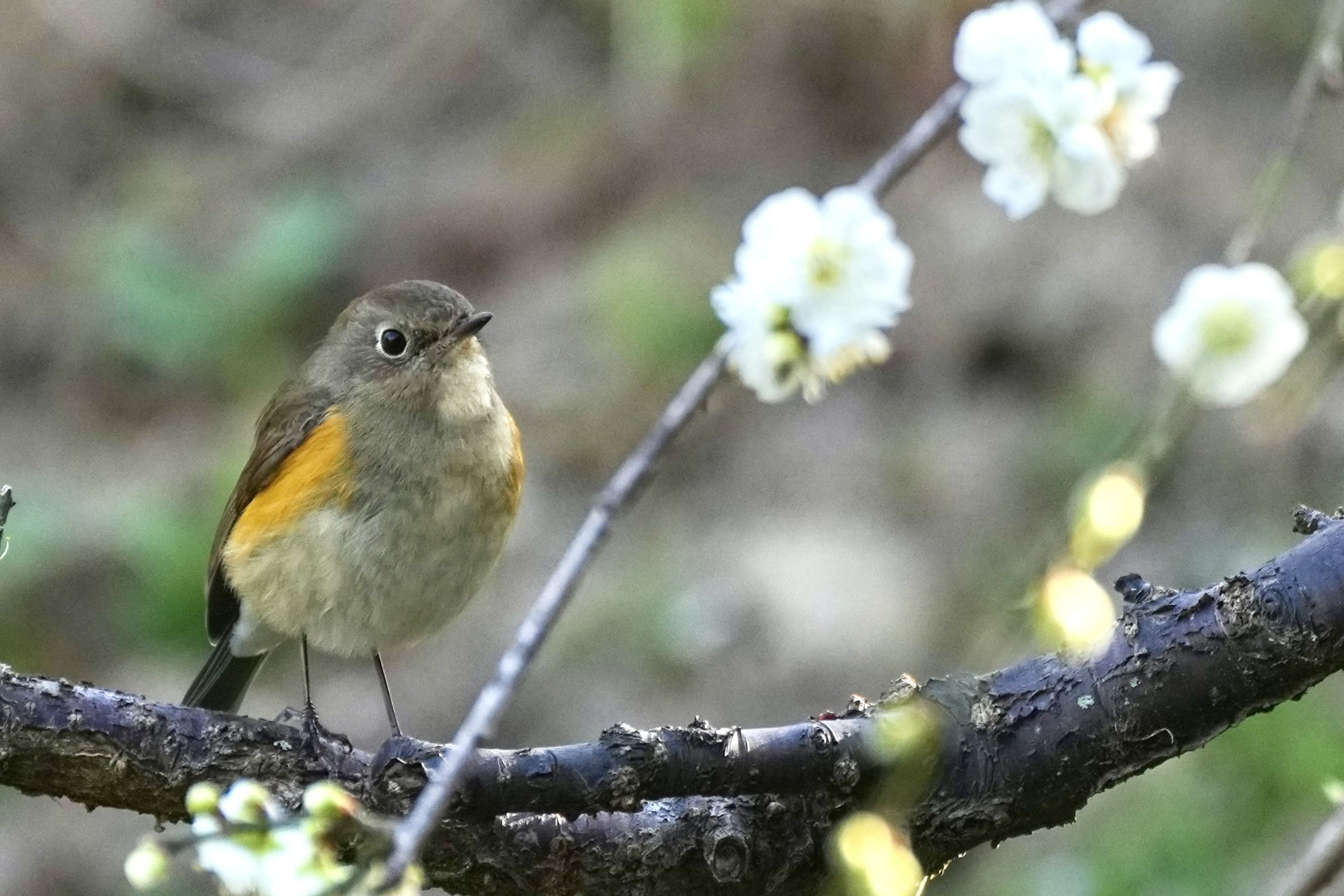 白梅に囲まれたルリビタキは、なぜか怒り顔ですね