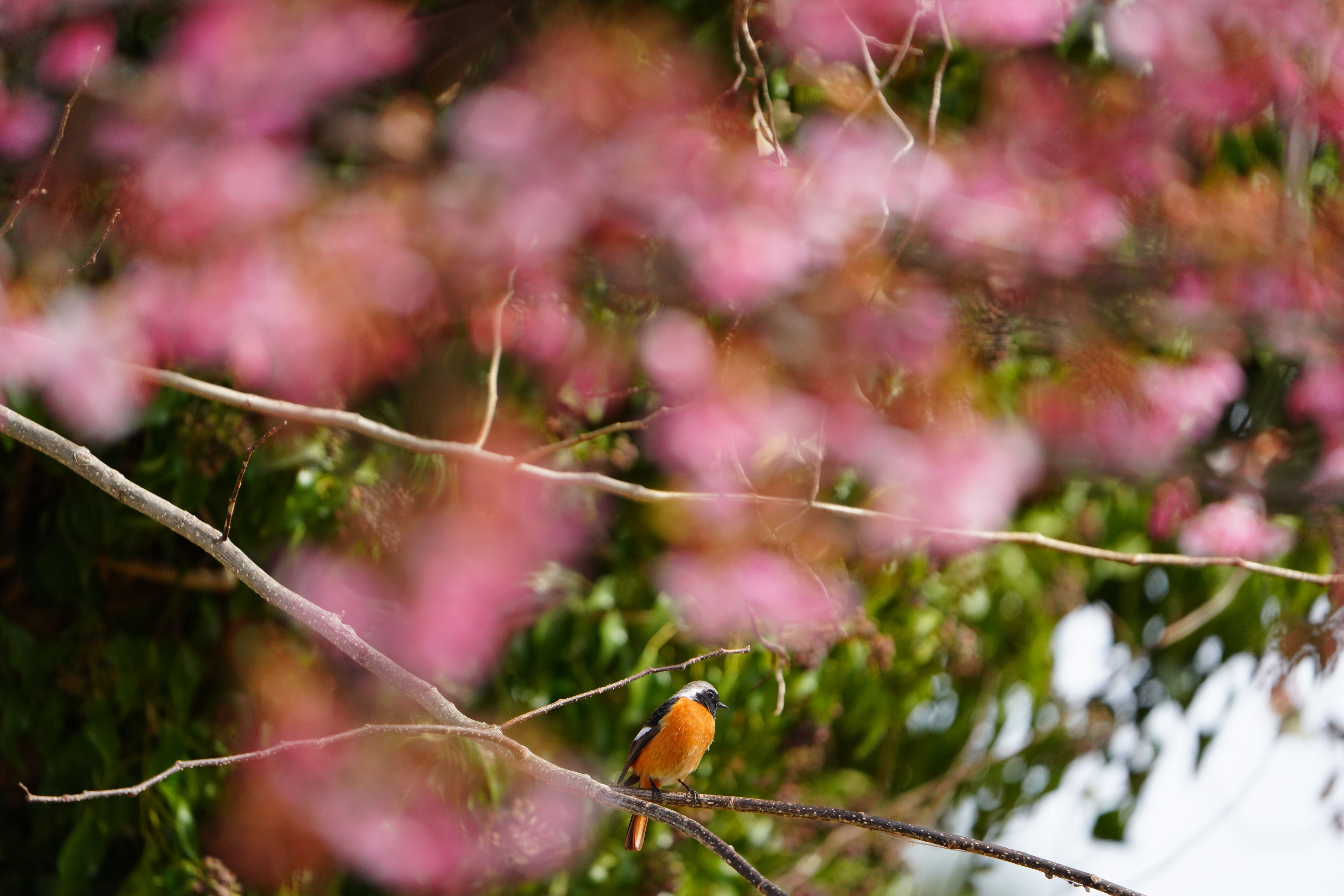河津桜越しのジョウビタキ。冬の風物と春の風物の対比、オレンジとピンクの対比を意図しました。